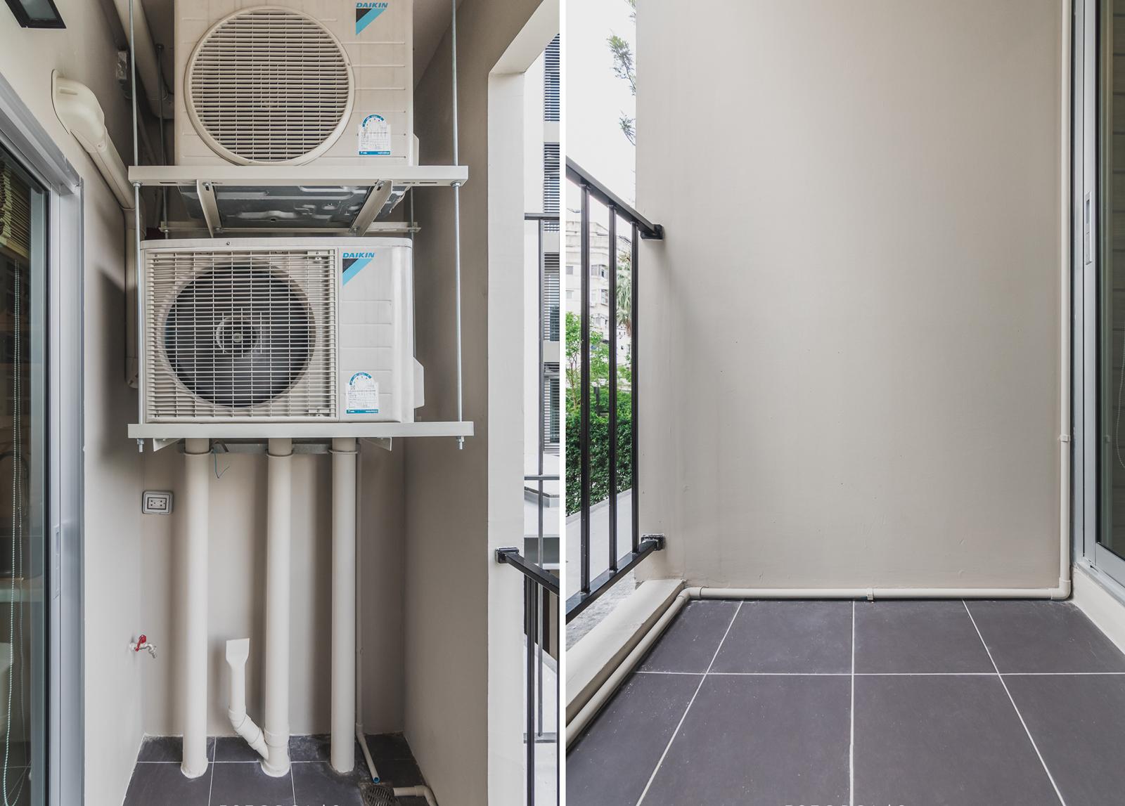 ฝั่งคอมเพรสเซอร์แอร์ สูงจากพื้นประมาณ 120 เซนติเมตรในทิศทางหันเข้าอาคาร หากต้องการตั้งเครื่องซักผ้าก็สามารถติดตั้งได้ทันที เพราะมีระบบท่อน้ำให้เรียบร้อย ส่วนฝั่งตรงข้ามปล่อยโล่ง หากติดราวตากผ้าไว้จุดนี้ ก็จะช่วยให้ผ้าแห้งเร็วขึ้น หรือจะทำสวนแนวตั้งก็เป็นการช่วยเพิ่มความสดชื่นให้กับคอนโดได้เป็นอย่างดี แต่ควรหลีกเลี่ยงตำแหน่งที่โดนลมร้อนโดยตรง