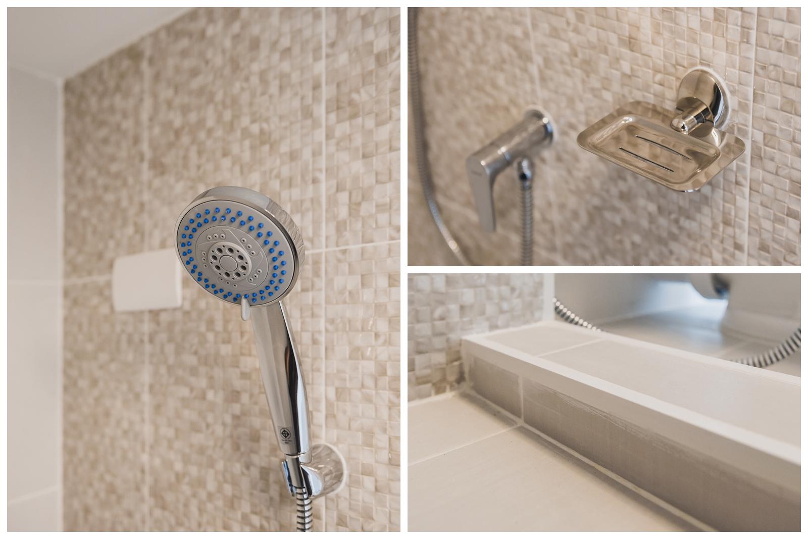 ชุดฝักบัวจาก COTTO มาคู่กับแท่นวางสบู่ ส่วนข้างๆ จะเป็นตำแหน่งติดตั้งเครื่องทำน้ำอุ่นที่ทางโครงการเดินระบบไว้ให้เรียบร้อยพร้อมใช้งาน หากติดตั้งแล้ว อย่าลืมเดินสายดินเพื่อความปลอดภัยในการอยู่อาศัยกันด้วย ส่วนตรงพื้นห้องยกขอบสูงประมาณ 3 นิ้ว