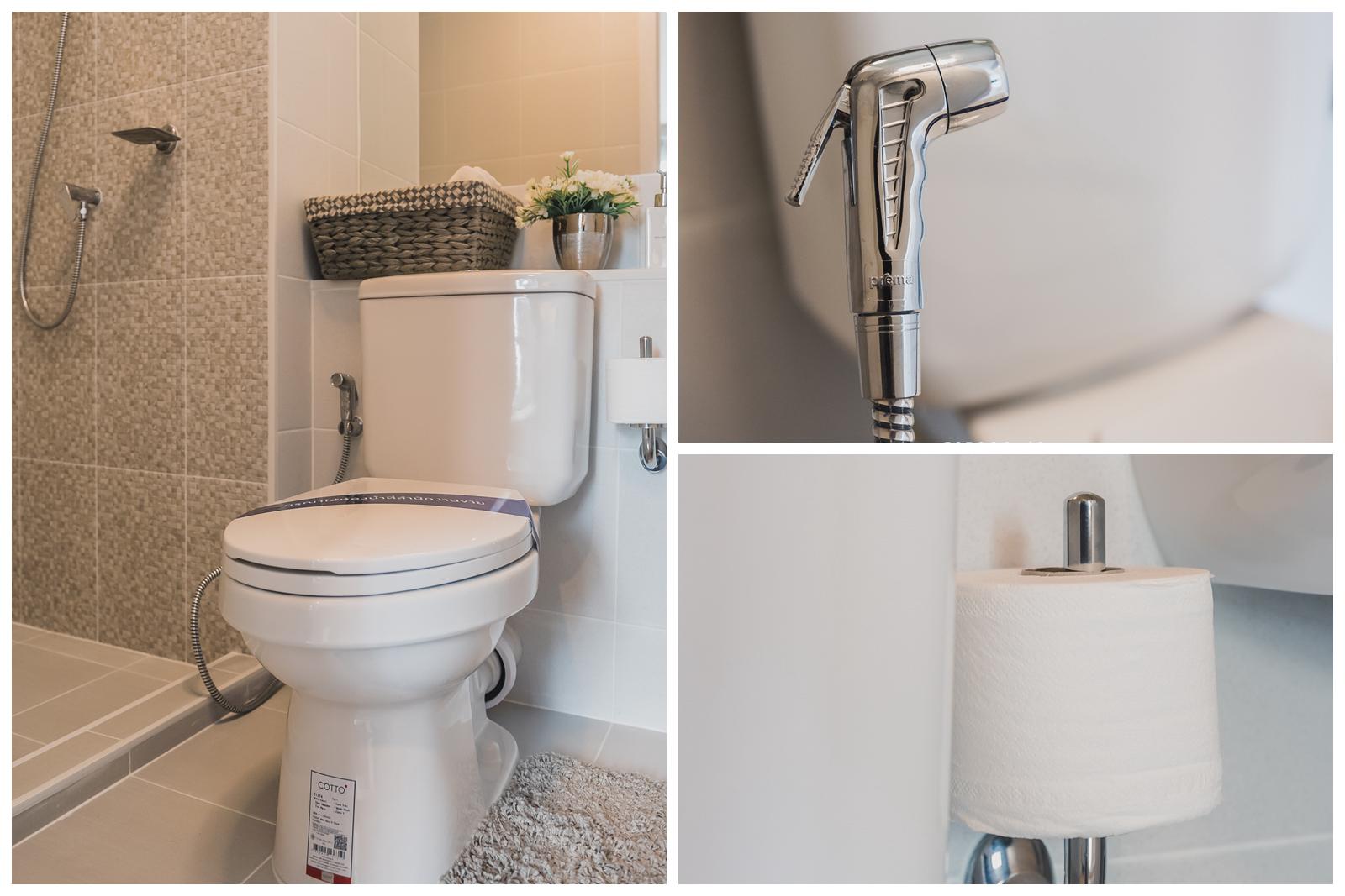 "โซนเปียก" ดูกว้างขวาง ทำให้เวลาเราอาบน้ำขัดสีฉวีวรรณก็ไม่รู้สึกอึดอัด พร้อมติดชุดฝักบัวแบบ Hand Shower ไว้ ซึ่งผู้พักอาศัยสามารถติดพาร์ติชั่นเพื่อป้องกันน้ำกระเด็นออกมาด้านนอกได้