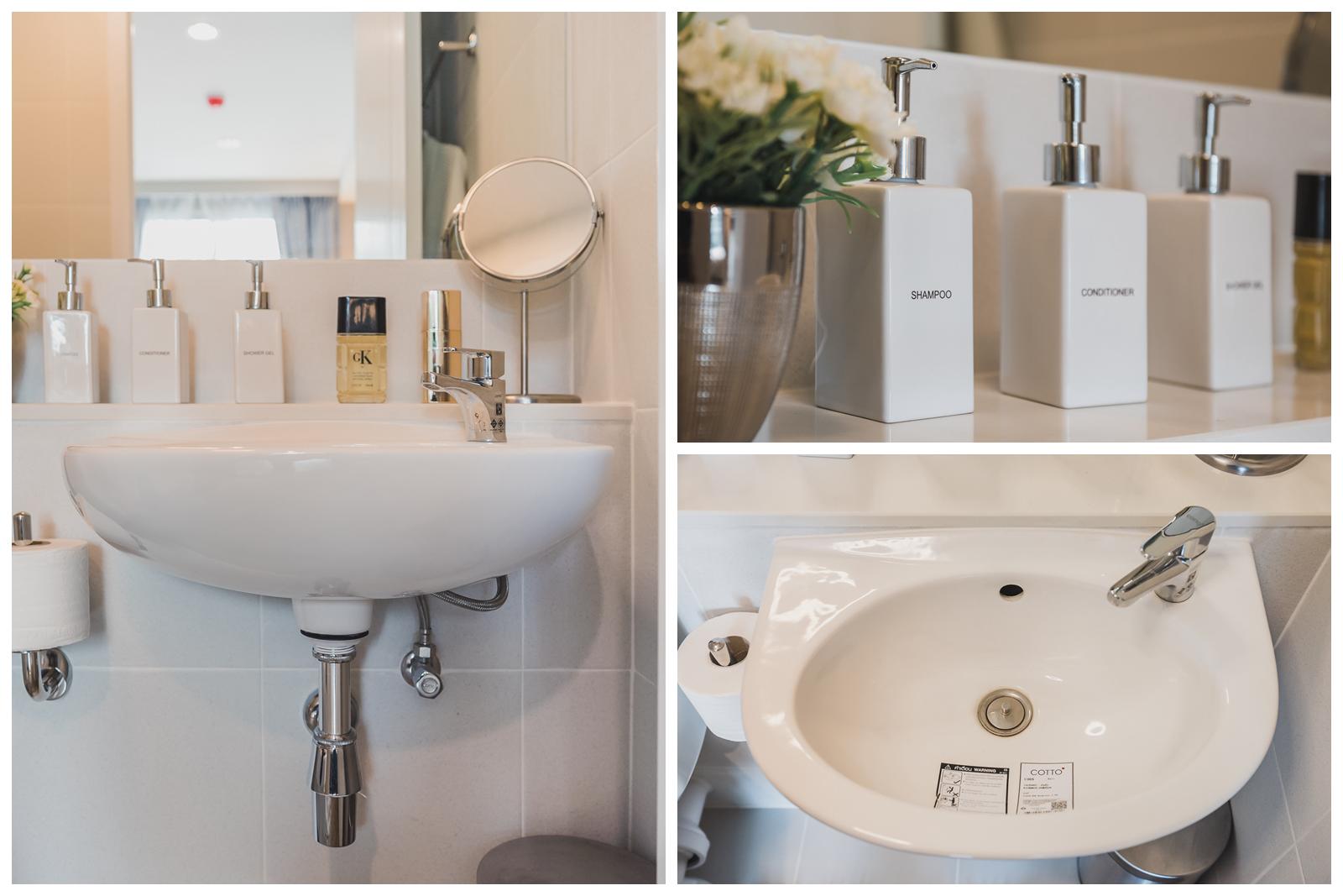 ถัดเข้าไปจะเป็น "ห้องน้ำ" ที่อยู่ติดกัน ทำให้ง่ายต่อการแต่งตัวและใช้งานเวลากลางคืน ตรงหน้าห้องจะยกพื้นสูงประมาณ 5 นิ้ว เพื่อป้องกันน้ำเปื้อนออกมา ซึ่งแนะนำให้วางพรมเช็ดเท้าร่วมด้วย