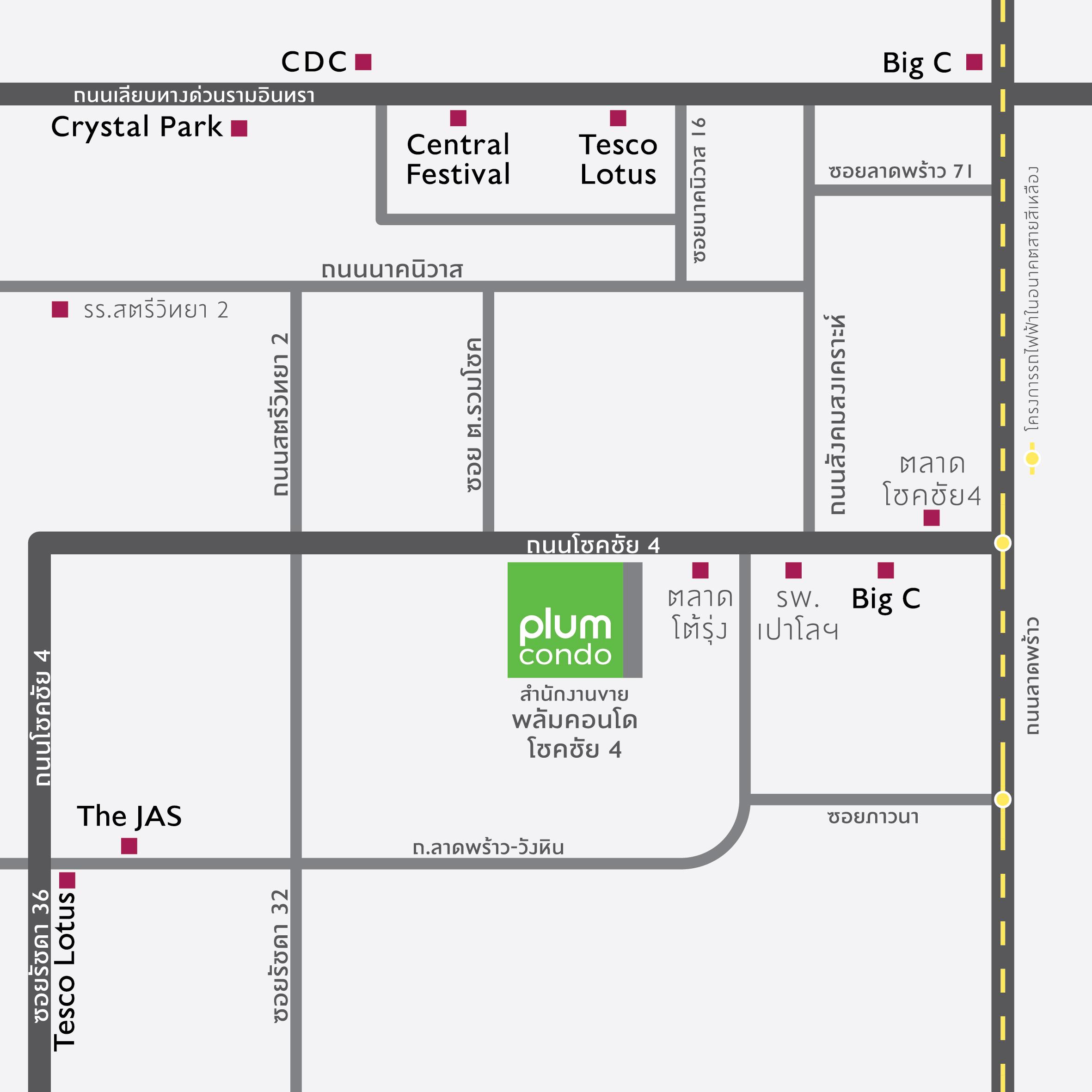 สำหรับที่ใครอยากทราบเส้นทางมายังโครงการ ก็สามารถเข้าดู การเดินทางไป Plum Condo Chokchai 4 (พลัมคอนโด โชคชัย 4) ได้เลย