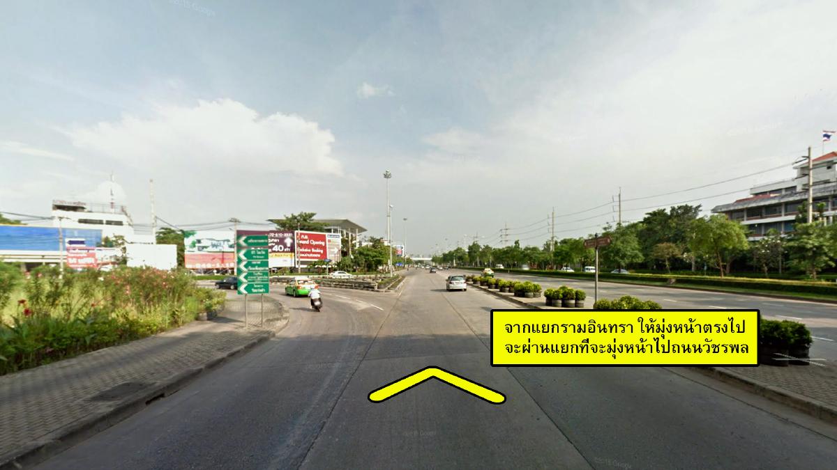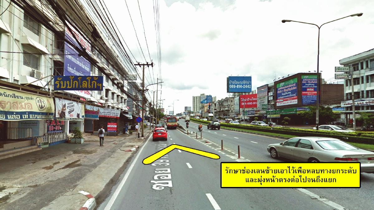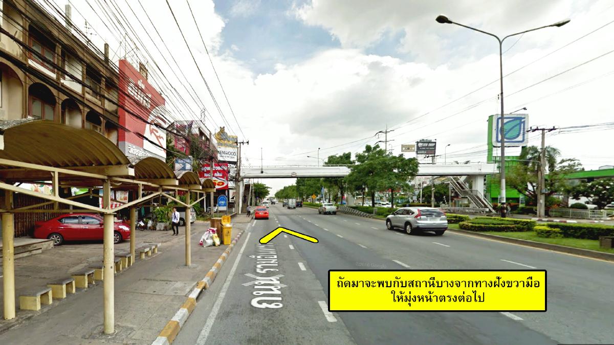 จุดสังเกตที่เห็นเป็นปั้มน้ำมันบางจากด้านขวามือ และสะพานลอยด้านหน้า ให้ขับโดยเลือกเลนขวามือเพื่อเตรียมเลี้ยวรถ