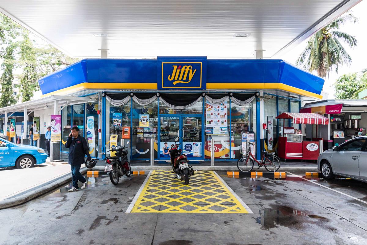 ที่หน้าร้าน Jiffy จะมีแผงลอยรายย่อยขนาดเล็ก ที่ขายอาหารว่างอยู่ เช่น หมูปิ้ง ชาไข่มุก