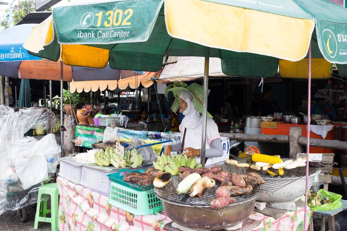 ร้านค้าแผงลอยนี้จำหน่ายอาหารว่างประเภทมันเผา กล้วยปิ้ง และข้าวโพดปิ้ง