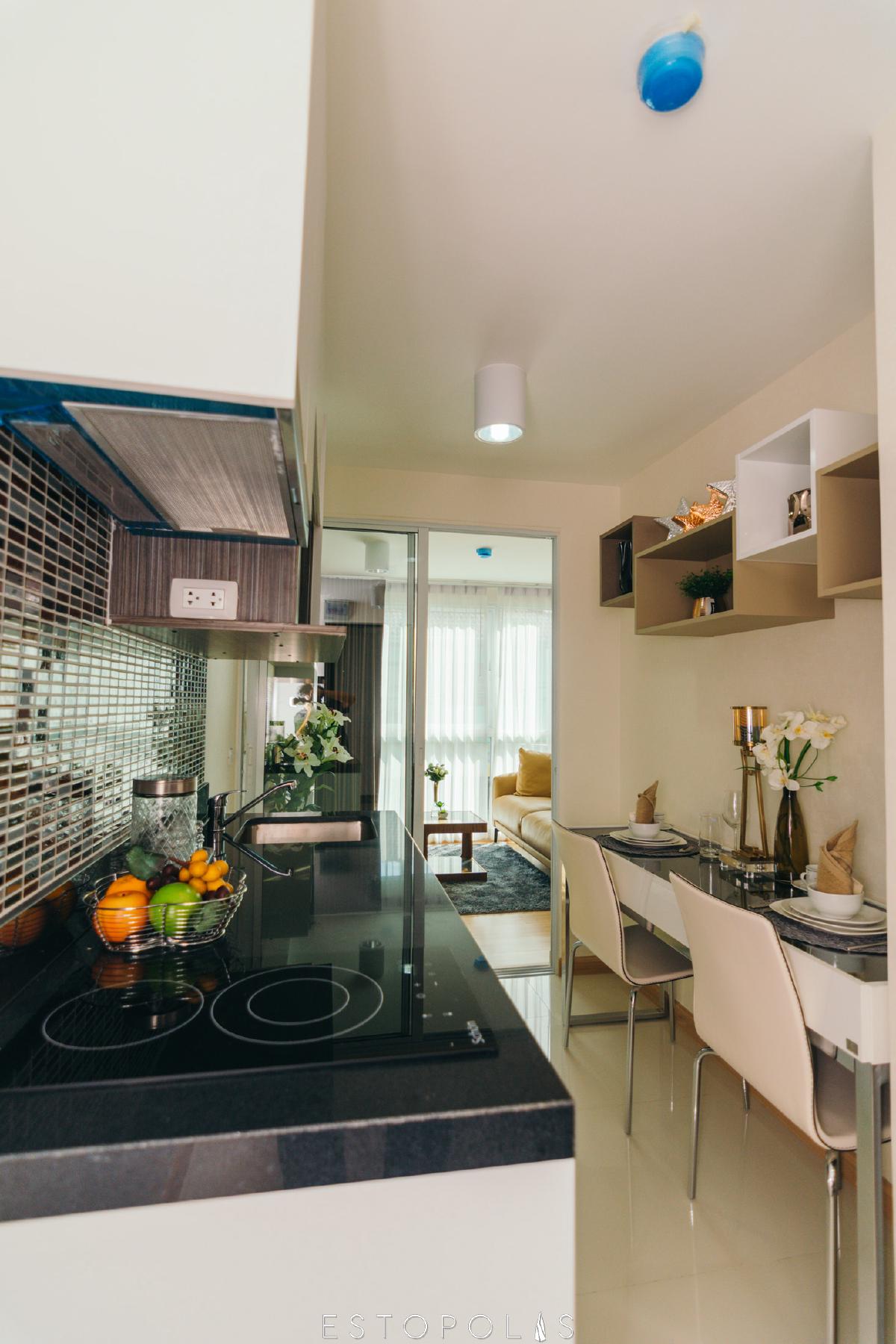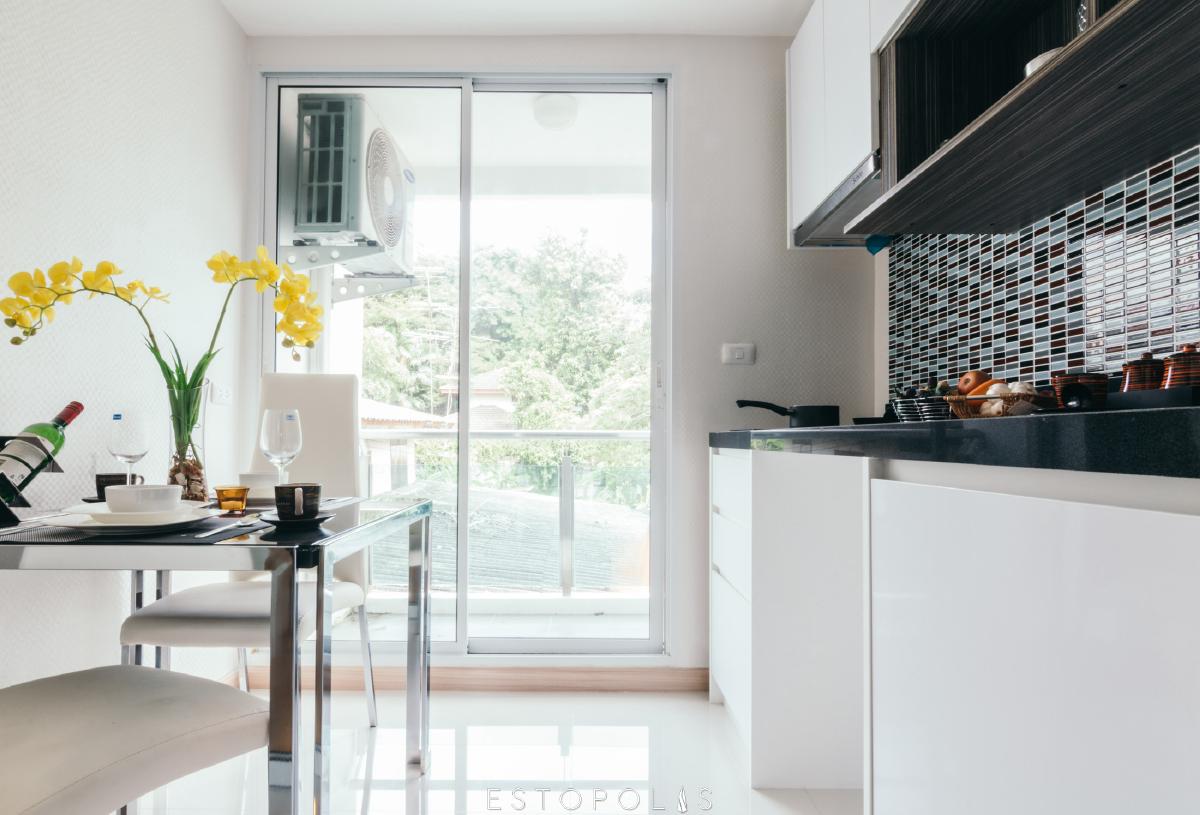 เมื่อเปิดเข้ามา จะพบกับห้องครัวที่เป็นแบบปิดก่อนเลย ซึ่งแบบปิดนี้จะช่วยให้การทำอาหารแต่ละมื้อสะดวกยิ่งขึ้น ช่วยป้องกันไม่ให้กลิ่นควันรบกวนส่วนอื่นๆ ของห้อง เคาน์เตอร์ครัว Built in ติดผนังสูงตั้งแต่เพดานถึงพื้น เพิ่มพื้นที่เก็บของ และพื้นของห้องครัวจะเป็นพื้นปูกระเบื้อง เพื่อให้สะดวกเวลาเช็ดล้างทำสะอาด ไม่ทิ้งรอยคราบให้กวนใจ
