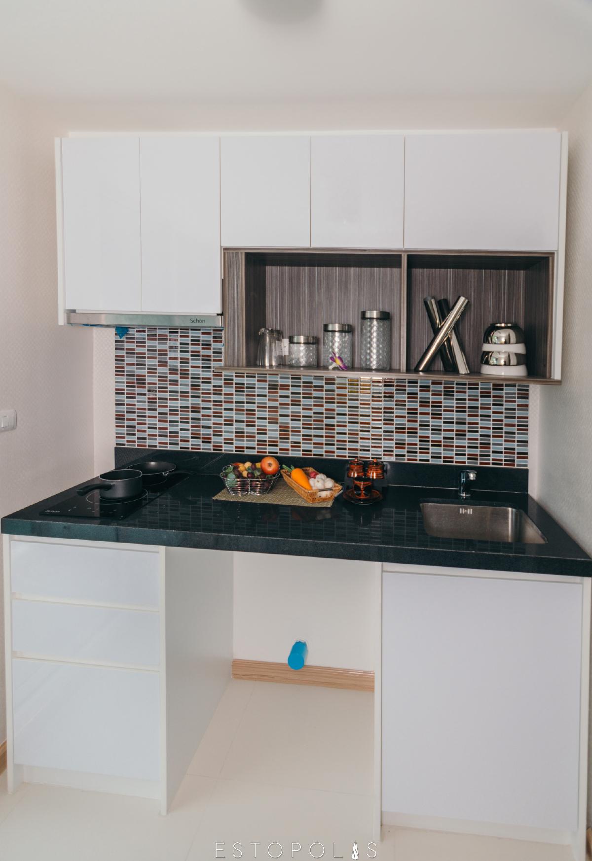 เคาท์เตอร์จะมีช่องเก็บของ ช่องวางไมโครเวฟ ส่วน Top ครัวเป็นหินสังเคราะห์เหมาะสำหรับการประกอบอาหารมื้อหนัก ทนต่อแรงกระแทก ไม่ว่าจะสับ เฉาะ ตรงกลางมีพื้นที่ประกอบอาหารเยอะ สามารถวางจานชามได้พร้อมกันหลายใบ ขนาบข้างด้วยซิงค์ล้างจานและเตาไฟฟ้า และด้านหลังเคาน์เตอร์ยังกรุกระเบื้องโมเสคเพิ่ม ช่วยให้เช็ดทำสะอาดคราบสกปรกและคราบน้ำมันได้อย่างง่ายดาย