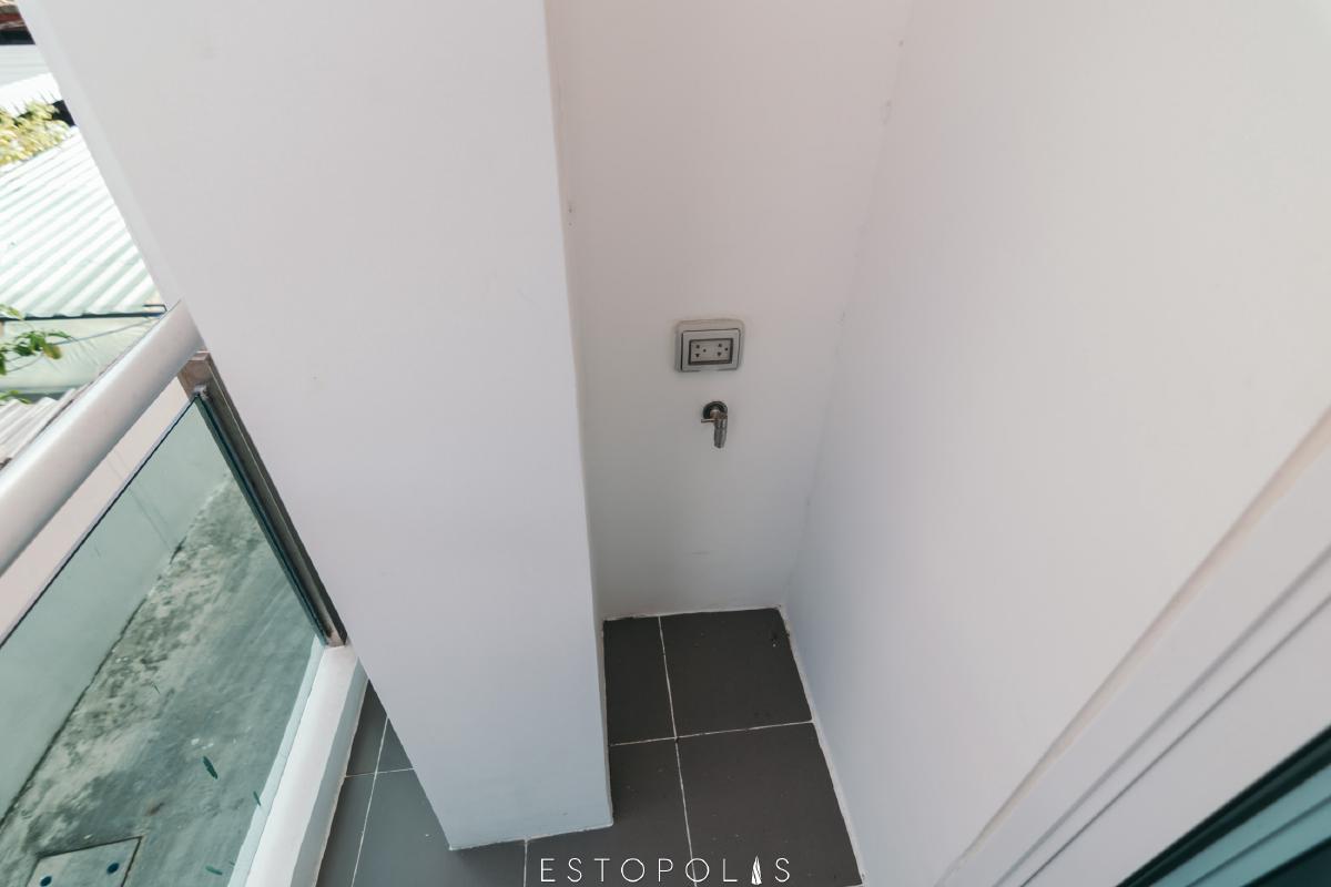 ระเบียง มีก็อกน้ำ ปลั๊กไฟสำหรับเครื่องใช้ไฟฟ้า เช่น เครื่องซักผ้า และมีท่อระบายน้ำเพื่อการซักล้าง