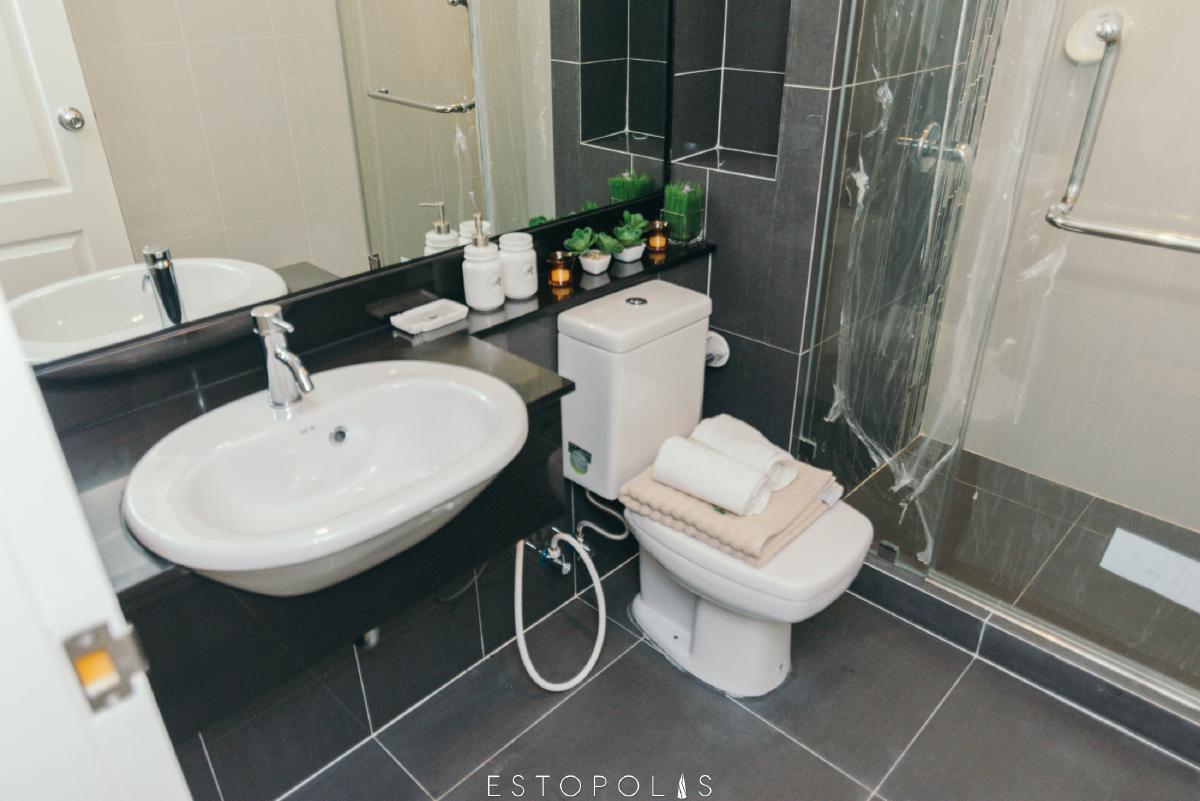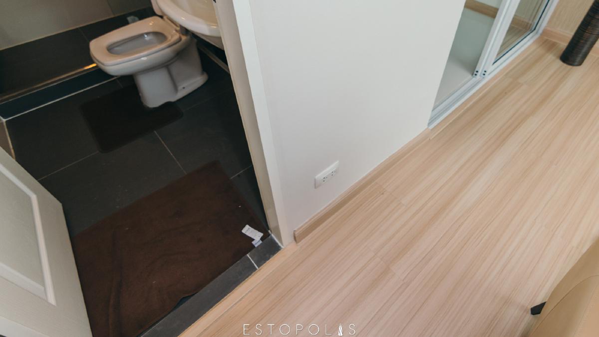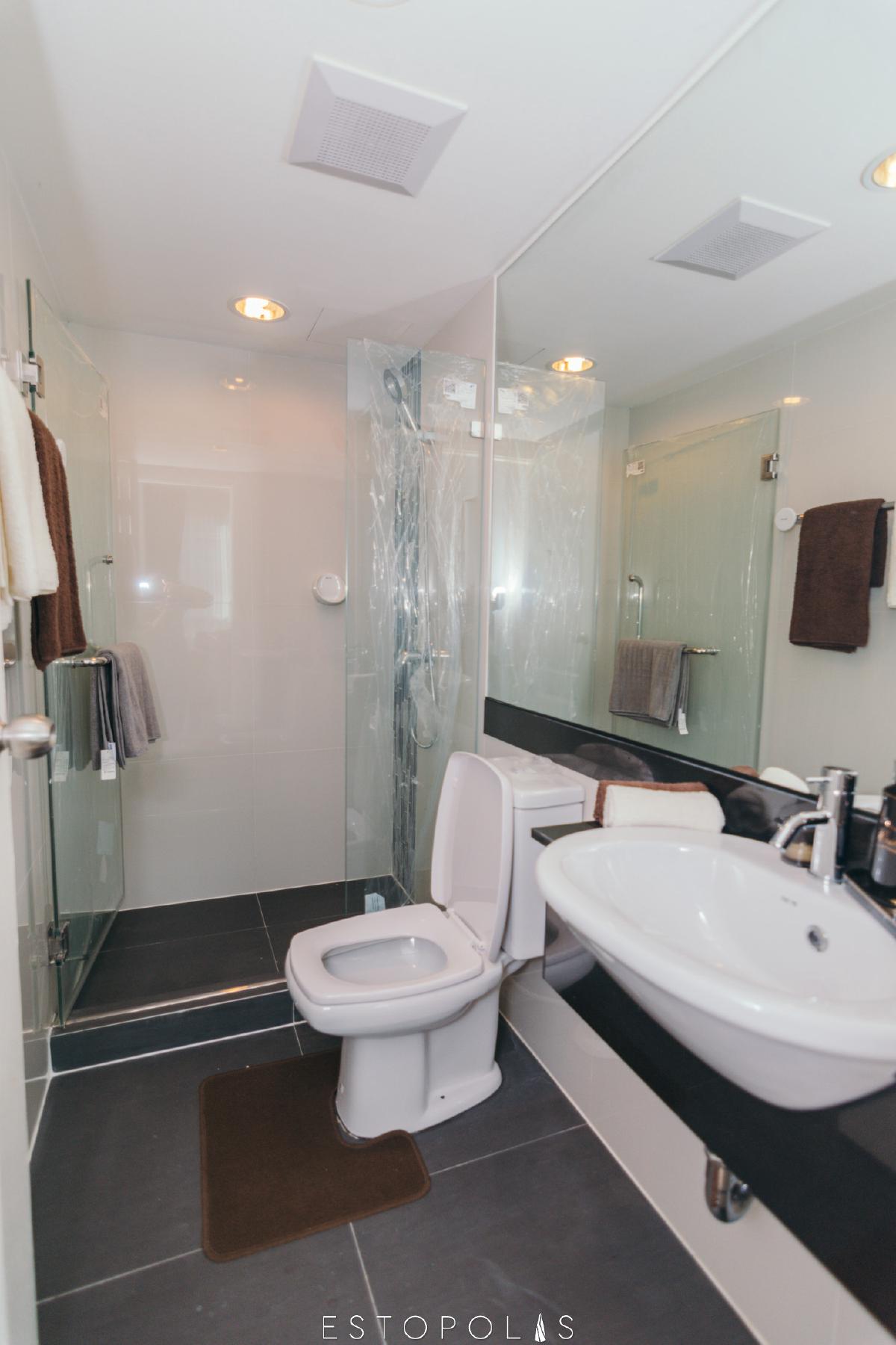 ห้องน้ำ แยกฟังก์ชั้นการใช้งานชัดเจน แบ่งโซนแห้งและเปียกด้วยแพลทติชั่นกระจก พื้นห้องน้ำปูกระเบื้องกันลื่นขนาด 60x60 cm ร่องชิดช่วดลดคราบสกปรกฝังตามร่องกระเบื้อง ประตูห้องน้ำเป็นบานสำเร็จรูป กลอนลูกบิดเช่นเดียวกับห้องนอน