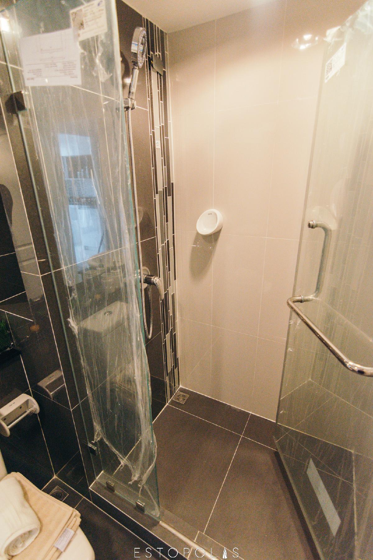 โถชักโครกอยู่ติดไปทางห้องอาบน้ำ ระยะการติดตั้งไม่อึดอัดแบบที่คนตัวใหญ่สามารถนั่งทำธุระได้สบาย หัวสายฉีดชำระเป็นพลาสติดต้องระวังการกระแทก เพราะชำรุดแตกหักง่ายกว่าหัวประเภทอื่น