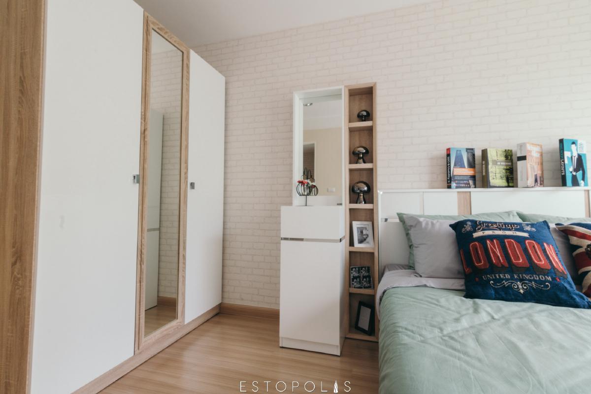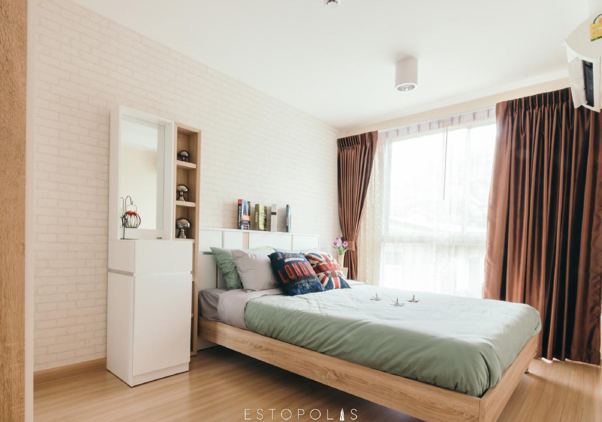 ข้างเตียงจะมีหน้าต่างบานใหญ่ ที่มีแสงผ่านเข้ามา ทำให้ห้องดูสดใส น่าพักผ่อน แต่ควรระวังเรื่องแสงอาจจะจ้ามาเกินไป ทำให้รบกวนการนอนหลับได้ วิธีการแก้คือใช้ผ้าม่านสีทึบ กันแสงไม่ให้ลอดผ่านเข้ามาได้ และนอกจากนี้ยังมีมุมตู้เสื้อผ้าอยู่บริเวณด้านในสุดของห้อง