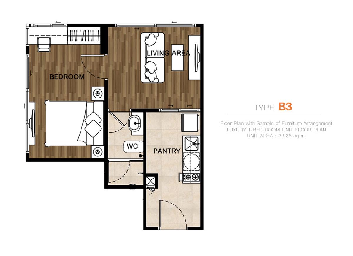 1 ห้องนอน พื้นที่ใช้สอย 32.35 ตารางเมตร