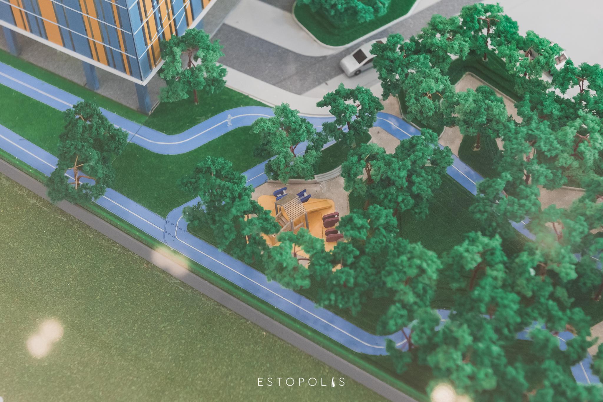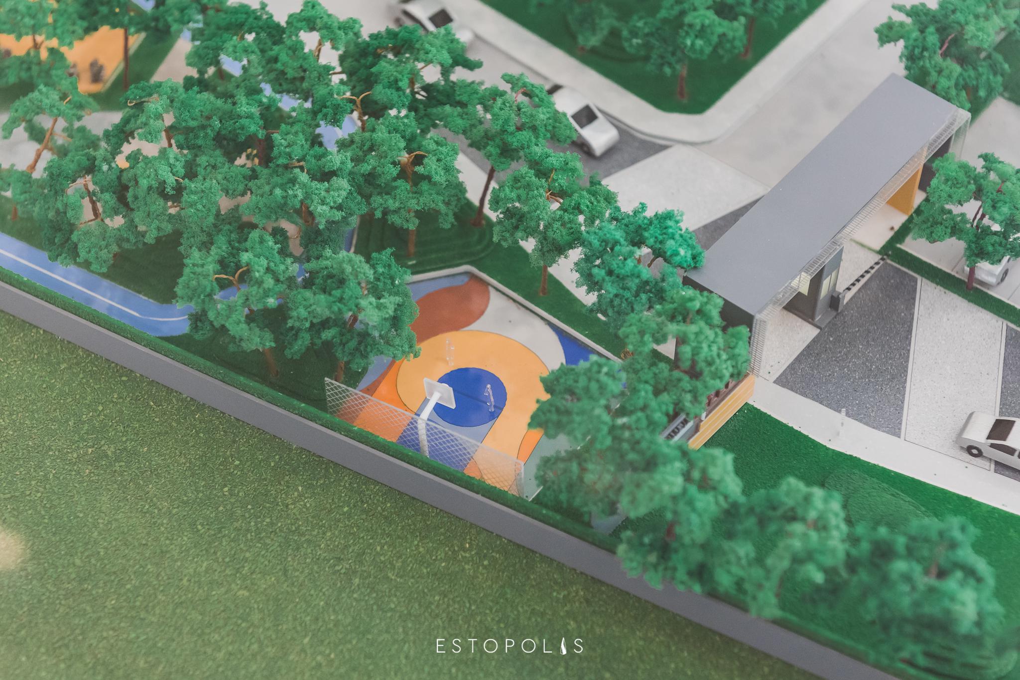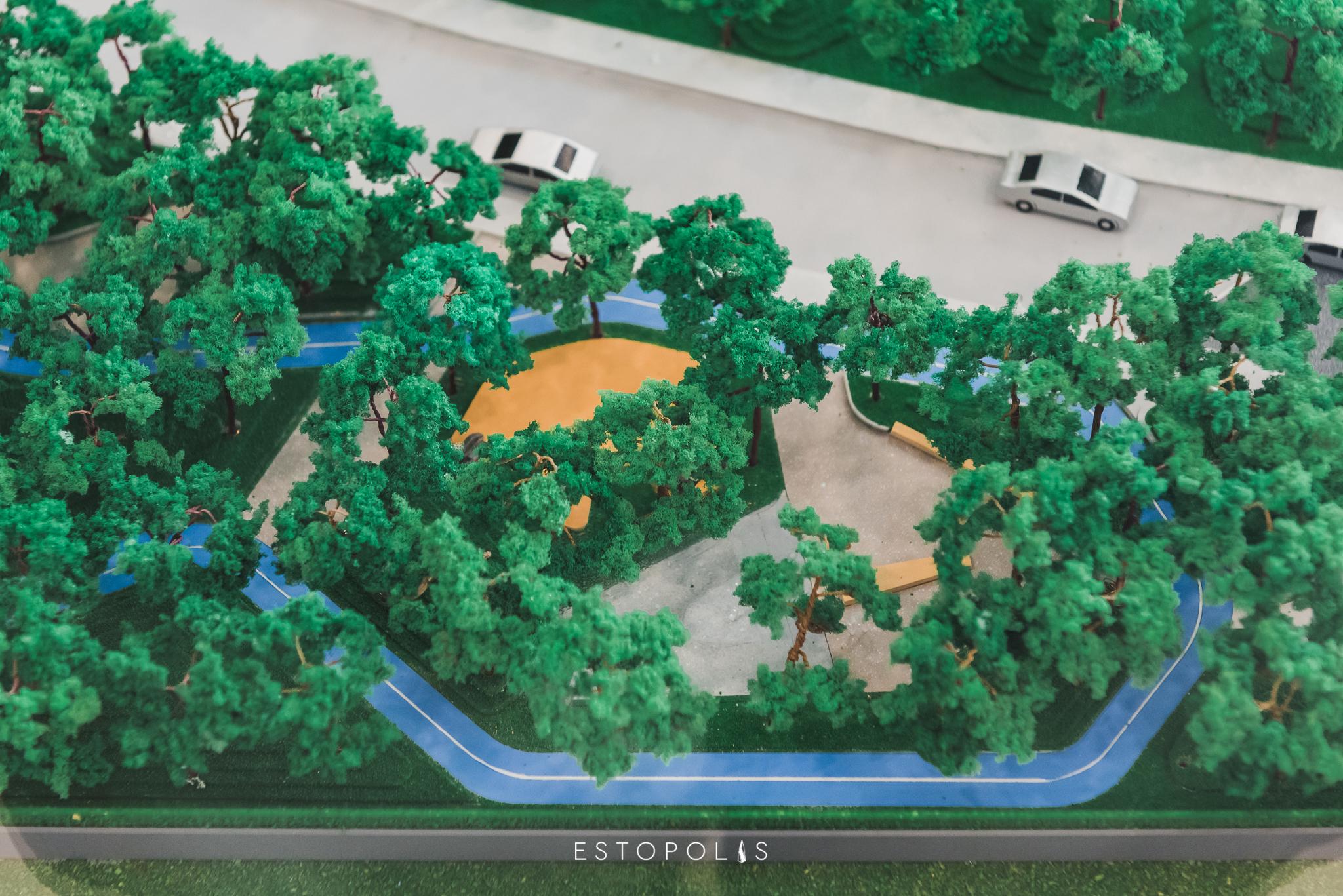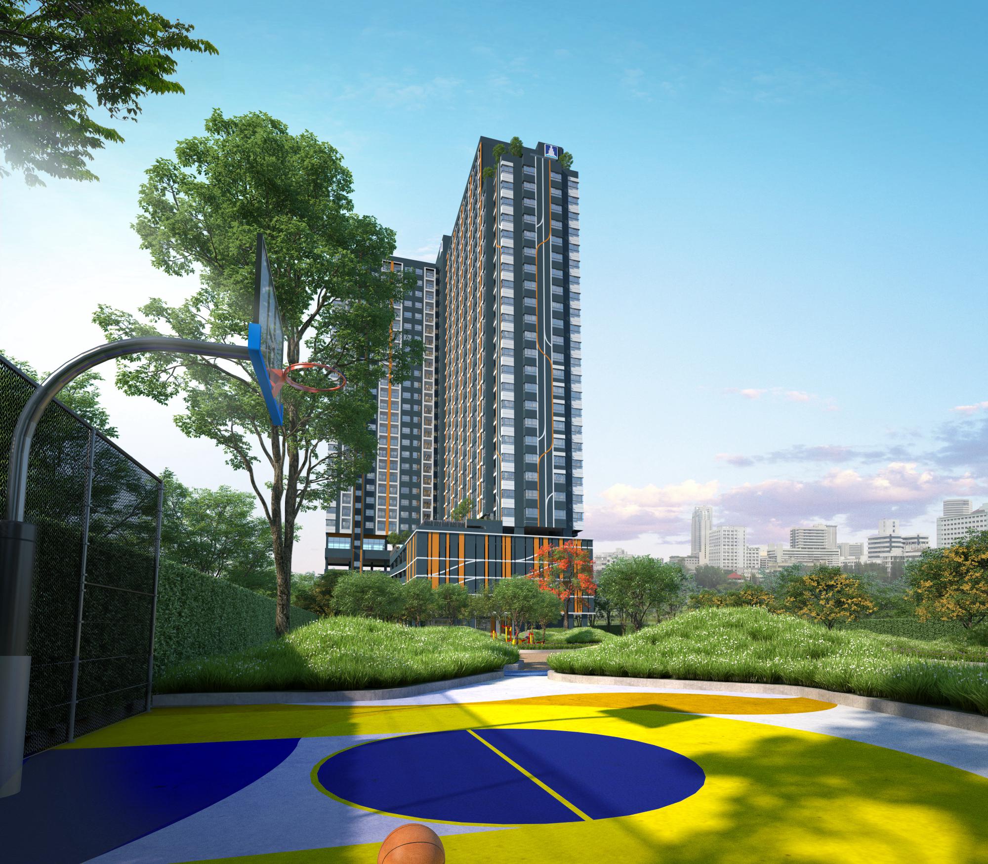 ด้านหน้าโครงการจะเป็นสนามสตรีทบาส ที่ให้ผู้อยู่อาศัยได้ออกกำลังกายเรียกเหงื่อกันเป็นทีม และหากมองจากสนามไปจะเห็นวิวสีเขียวของสวนสุขภาพและอาคารพักอาศัยได้