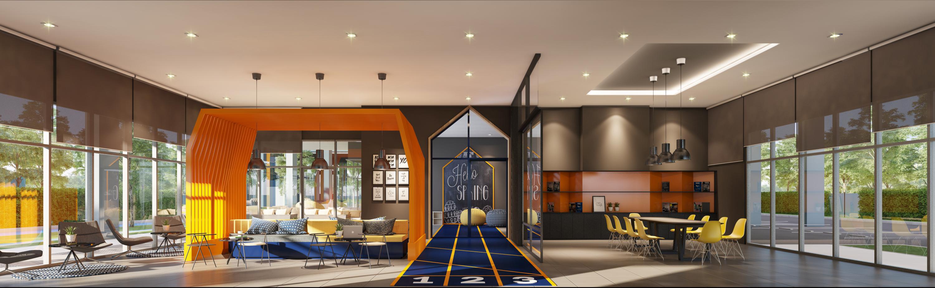 ขยับเข้ามาที่ Facilities ภายในตัวอาคาร ภาพจำลองที่เห็นอยู่นี้เป็นห้องอเนกประสงค์ออกแบบเป็นสไตล์ Sport ด้วยการใช้โทนสีที่ดูสนุกสนานอย่างคู่ตรงข้ามน้ำเงิน-ส้ม
