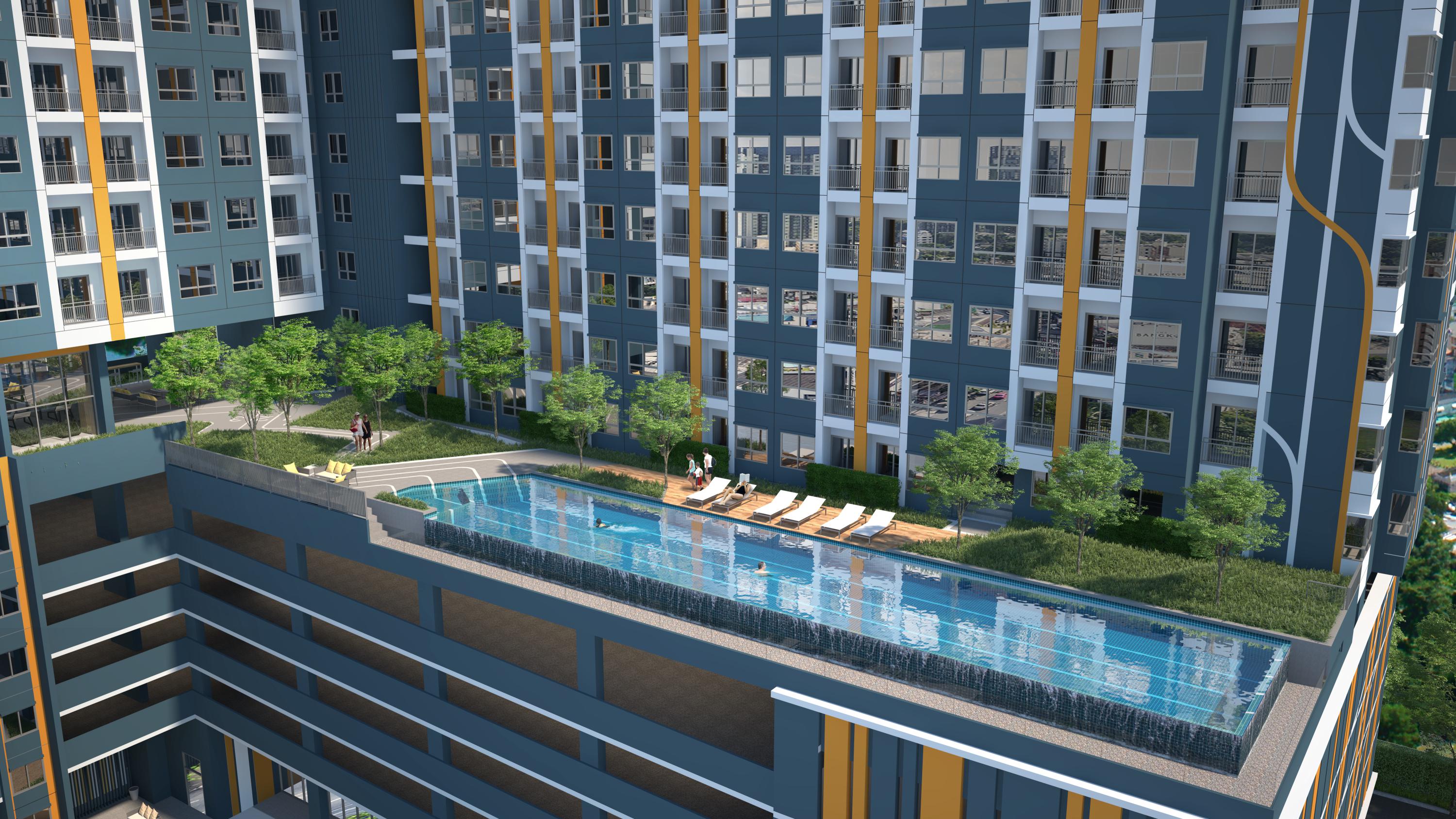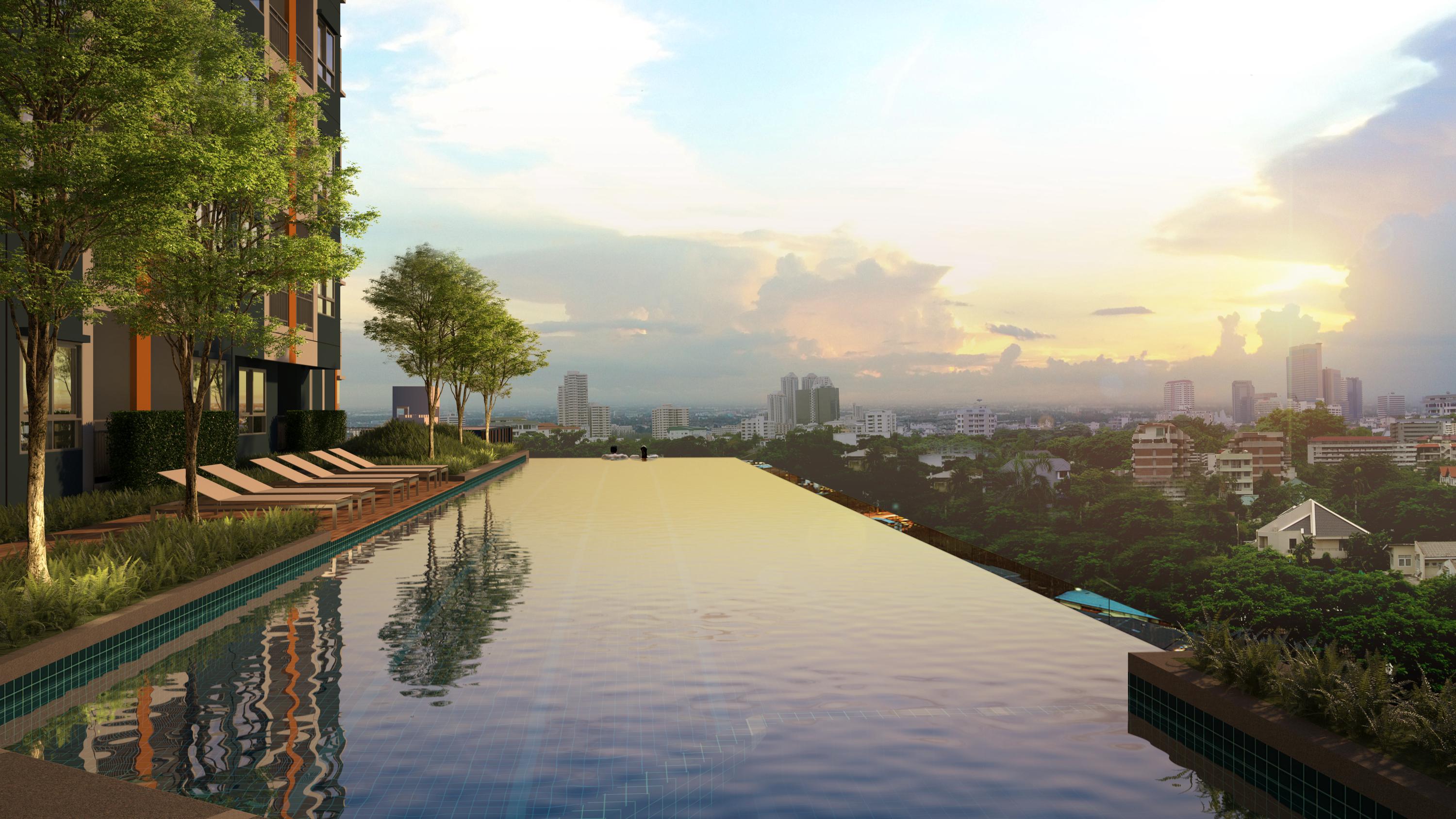 ภาพจำลองบรรยากาศของสระว่ายน้ำบริเวณชั้น 7 ของโครงการ Lumpini Ville Phattanakan - Srinakarin (ลุมพินี วิลล์ พัฒนาการ - ศรีนครินทร์) ถูกออกแบบให้เป็นสระไร้ขอบด้วยการตกแต่งสวนไว้ด้านหนึ่งของสระเพื่อให้ความรู้สึกอิสระกับผู้ที่ใช้สระว่ายน้ำ