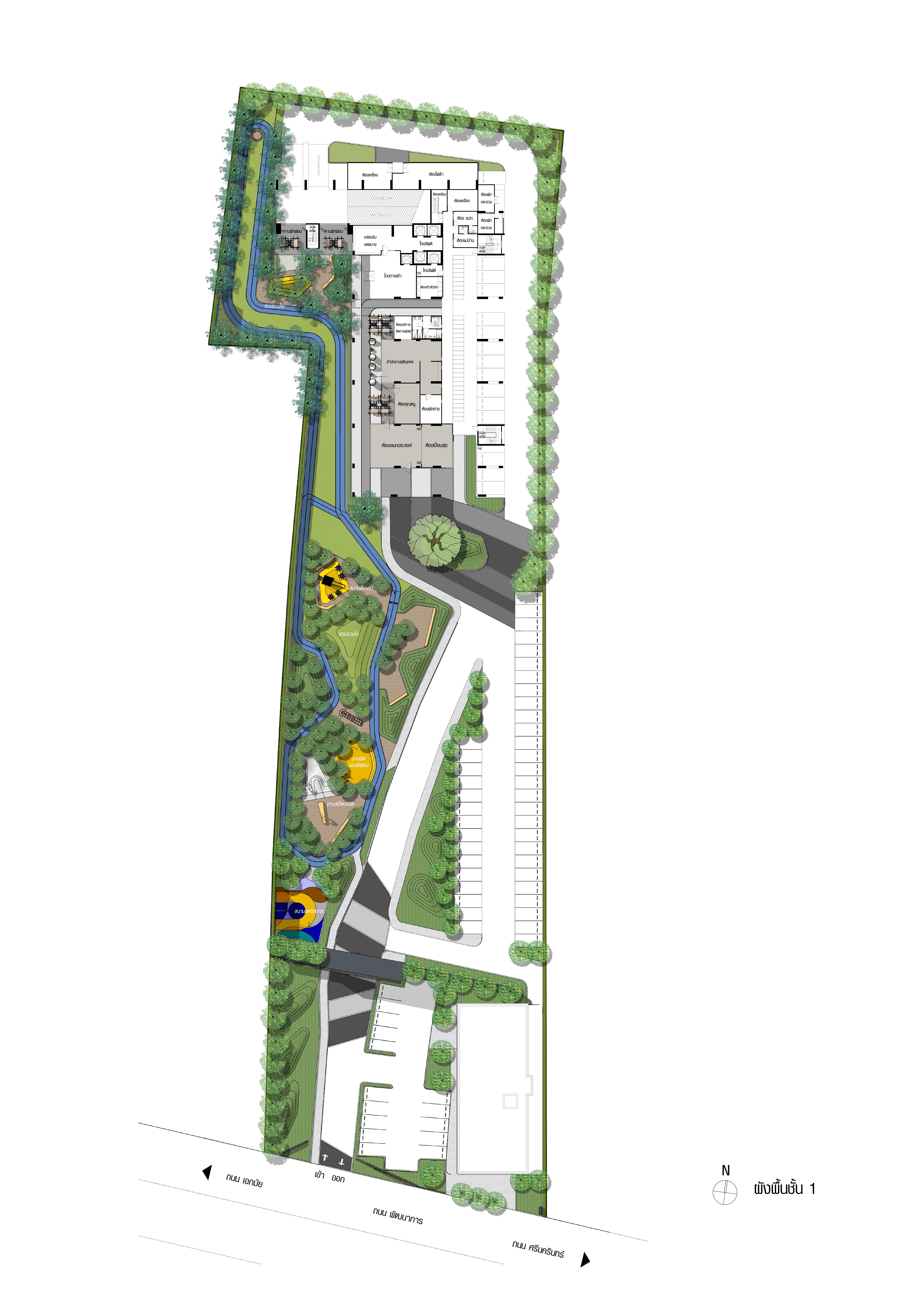 ถัดเข้ามาเป็นพื้นที่สำหรับนั่งเล่นชิลล์ๆ ของ 'สวนรวมใจ' และ 'สนามเด็กเล่น' ซึ่งรอบๆ ลานกิจกรรมทั้งสองจะมี 'Jogging Track' เอาไว้ให้วิ่งออกกำลังกาย ไปพร้อมกับสูดอากาศบริสุทธิ์ของต้นไม้ใหญ่ที่ปลูกเอาไว้ทั่วสวน