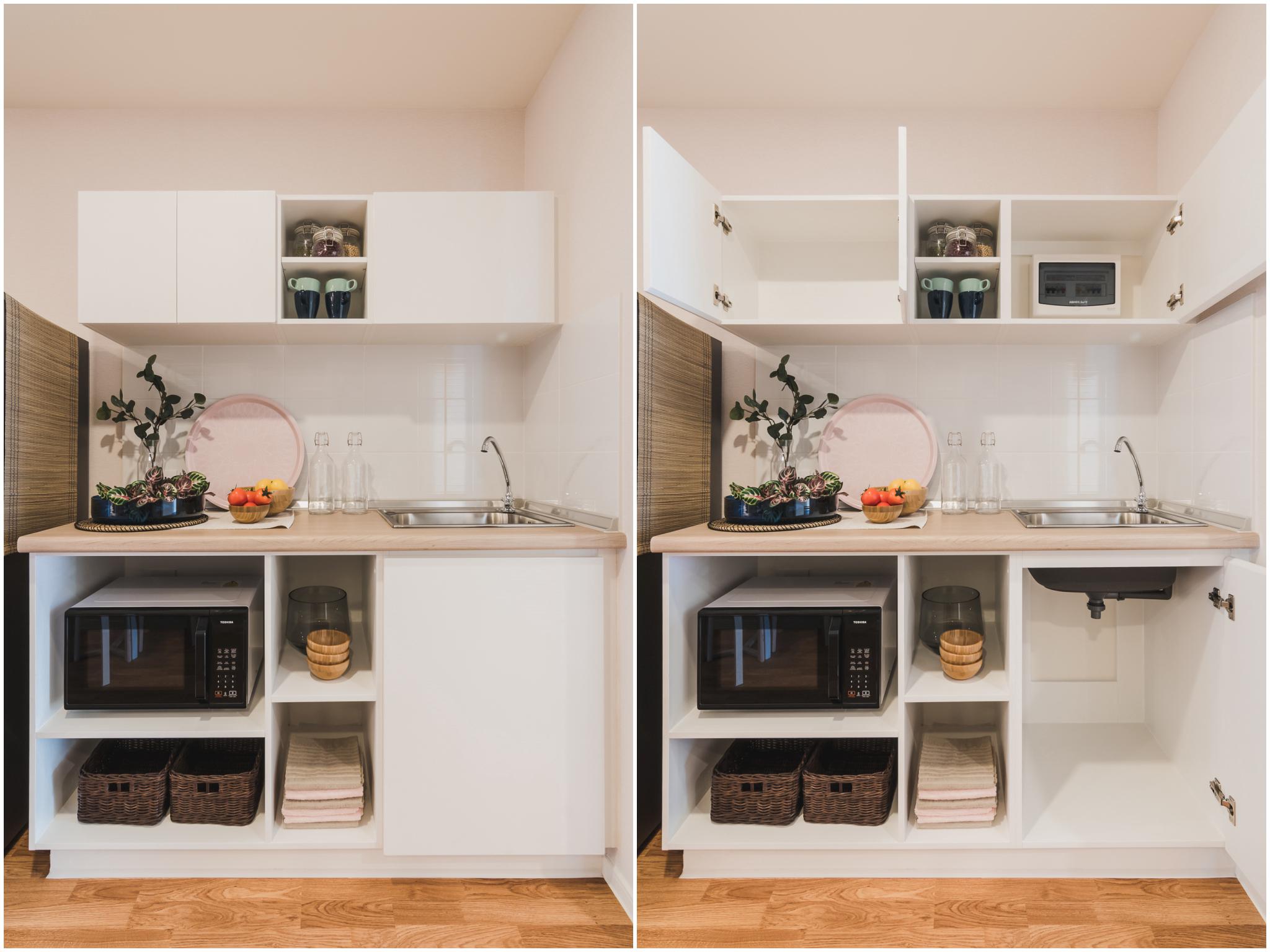 อีกฝั่งหนึ่งเหนือช่องใส่ไมโครเวฟขึ้นไปจะถูกเว้นไว้สำหรับจัดเตรียมอาหาร, วางเครื่องปรุงต่างๆ เพื่อให้หยิบสะดวกใกล้มือ ส่วนใครที่อยากทำอาหารแบบจัดเต็มก็อาจจะซื้อเตาไฟฟ้าแบบพกพามาใช้ร่วมได้ โดยทางโครงการจะมีปลั๊กไว้รองรับการใช้งานเตรียมให้เรียบร้อย