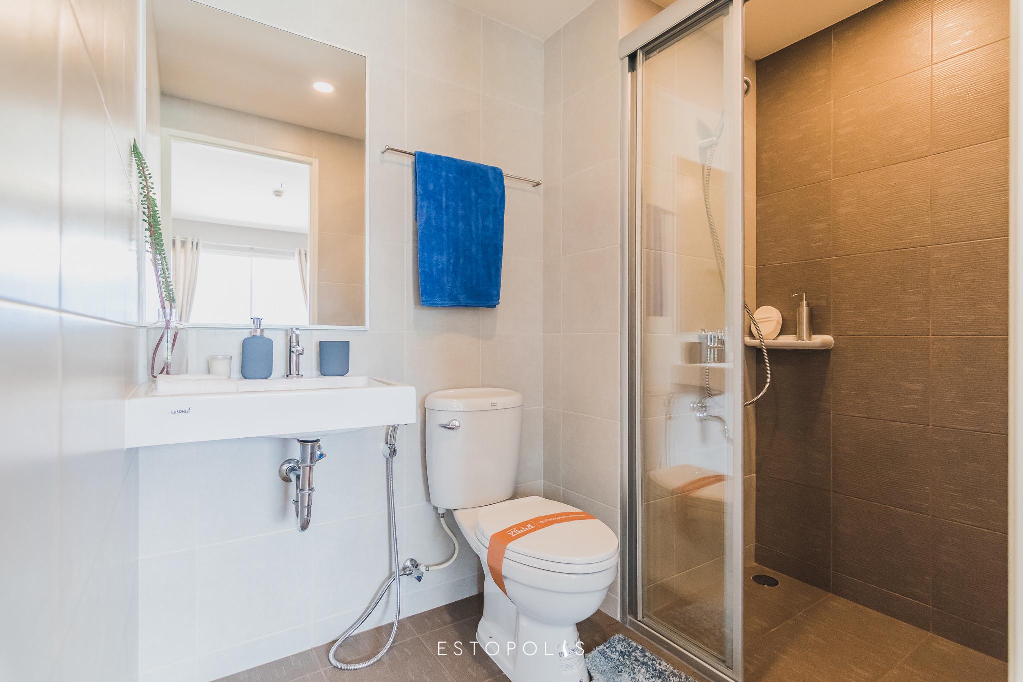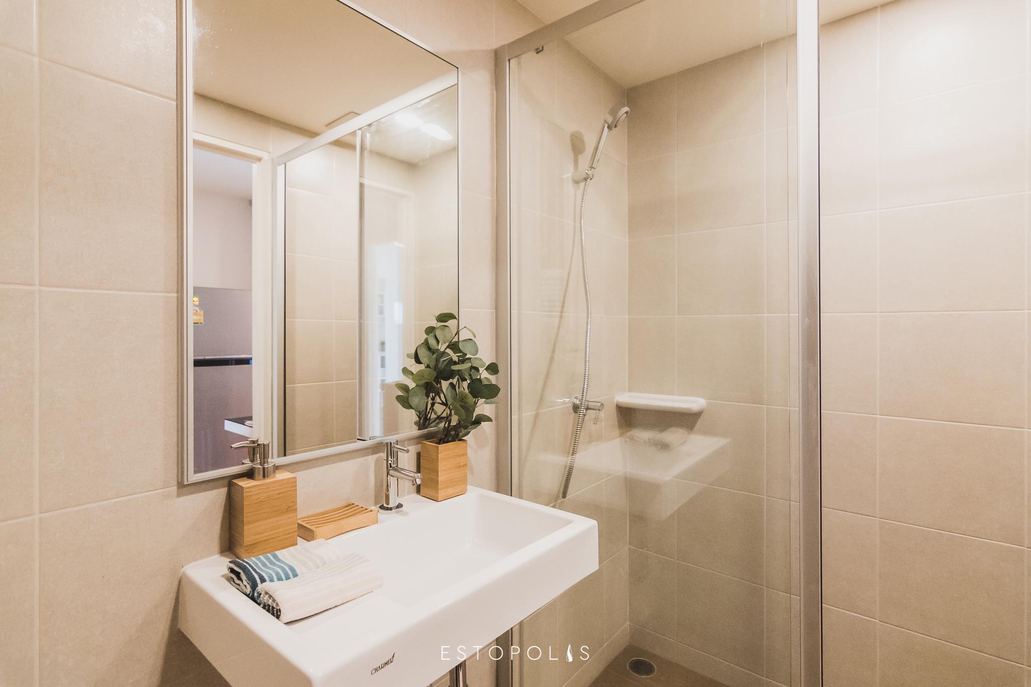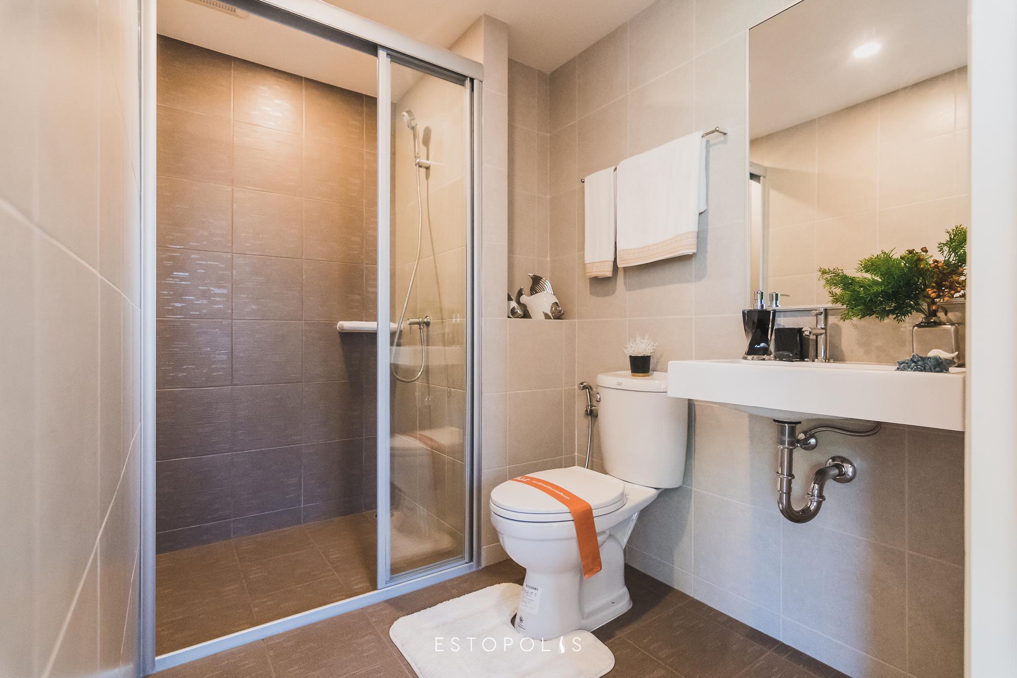 ภายในห้องน้ำถูกแยกฟังก์ชันโซนแห้งและโซนเปียกออกจากกันชัดเจน พร้อมทั้งติดตั้งสุขภัณฑ์ให้ครบชุด ผนังห้องน้ำกรุด้วยกระเบื้องสีครีม ยกเว้นบริเวณที่ติดตั้งโถสุขภัณฑ์ที่จะกรุด้วยกระเบื้องลายเดียวกับพื้นห้องน้ำเพื่อเพิ่มลูกเล่นให้ห้องดูมีมิติขึ้น