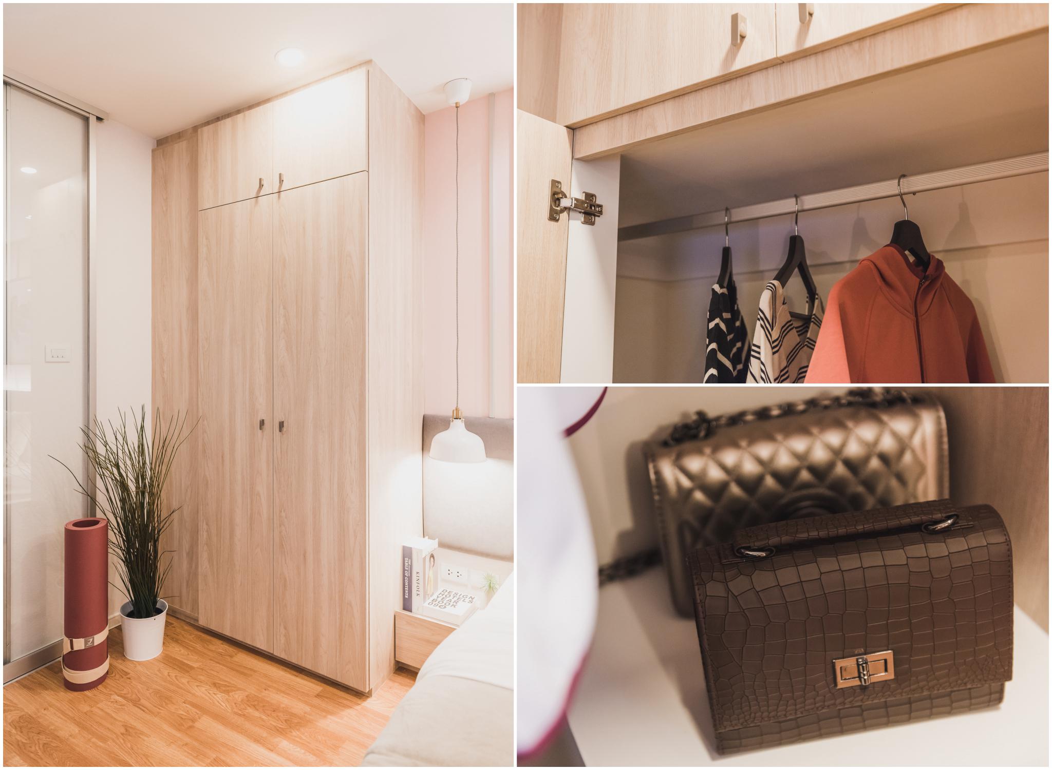 ฝั่งหนึ่งของเตียงนอนถูกบิลต์อิน (Built-in) เป็นตู้เสื้อผ้าลามิเนตที่มีขนาดและฟังก์ชันการใช้งานที่เหมาะสม