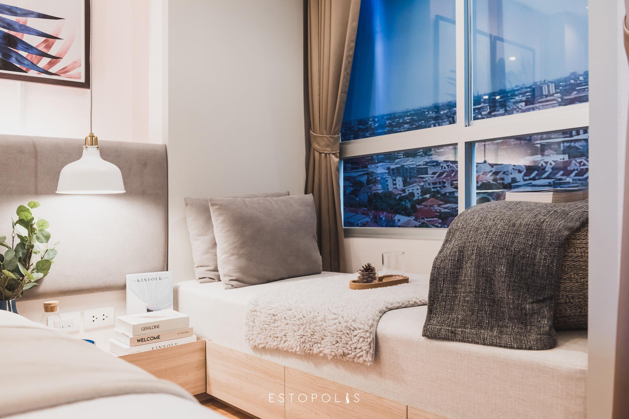 อีกฝั่งหนึ่งเป็นหน้าต่างเลื่อนผสมบานฟิกซ์ทำหน้าที่เป็นช่องรับแสงขนาดใหญ่ ทำให้ห้องดูสว่างและมองเห็นวิวด้านนอกได้ชัดเจน วันไหนอากาศดีๆ อาจจะเปิดรับลมระบายอากาศก็ได้ โดยบริเวณนี้ถูกจัดวางให้เป็นมุม Window Seat สุดพิเศษไว้ให้เราได้เอนตัวนอนสบายๆ ไปพร้อมกับการทำกิจกรรมที่ชอบอย่าง ดูหนัง, ฟังเพลง หรืออ่านหนังสือ
