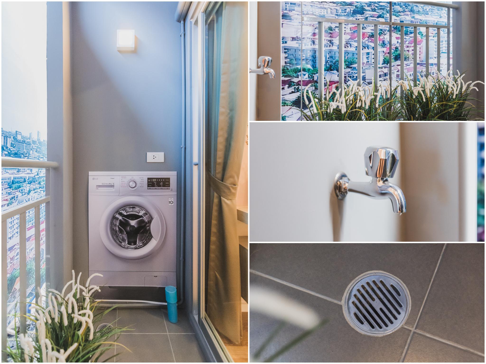 ระเบียงของ Lumpini Ville Phattanakan - Srinakarin (ลุมพินี วิลล์ พัฒนาการ - ศรีนครินทร์) ค่อนข้างกว้าง รองรับการใช้งานจริง ปูพื้นด้วยกระเบื้องและติดตั้งราวกันตกแบบโครงเหล็กสูง 1.2 เมตร พร้อมติดตั้งระบบท่อน้ำสำหรับซักล้าง, มีปลั๊กไฟ, ก็อกน้ำและไฟให้พร้อมใช้งาน