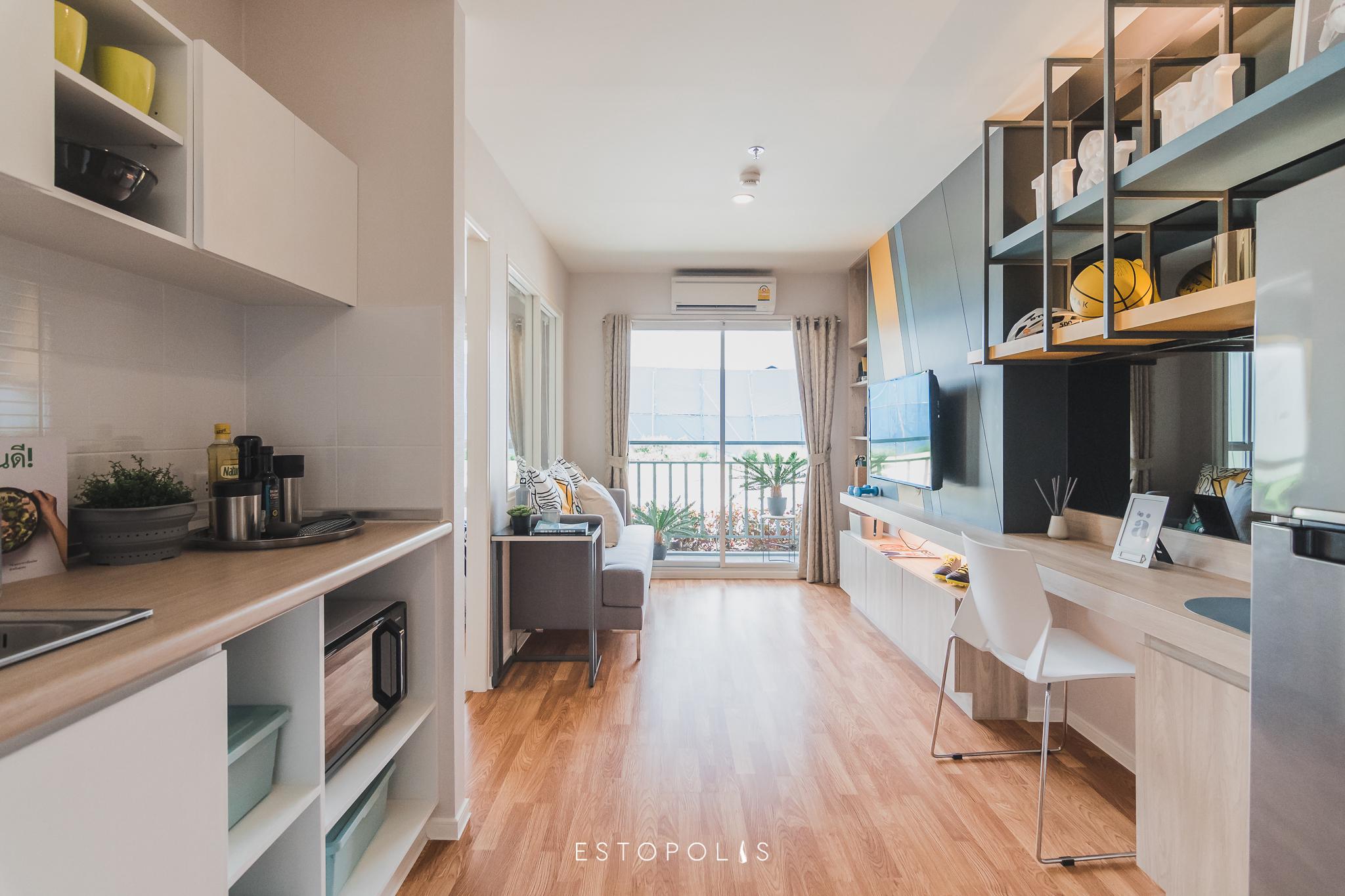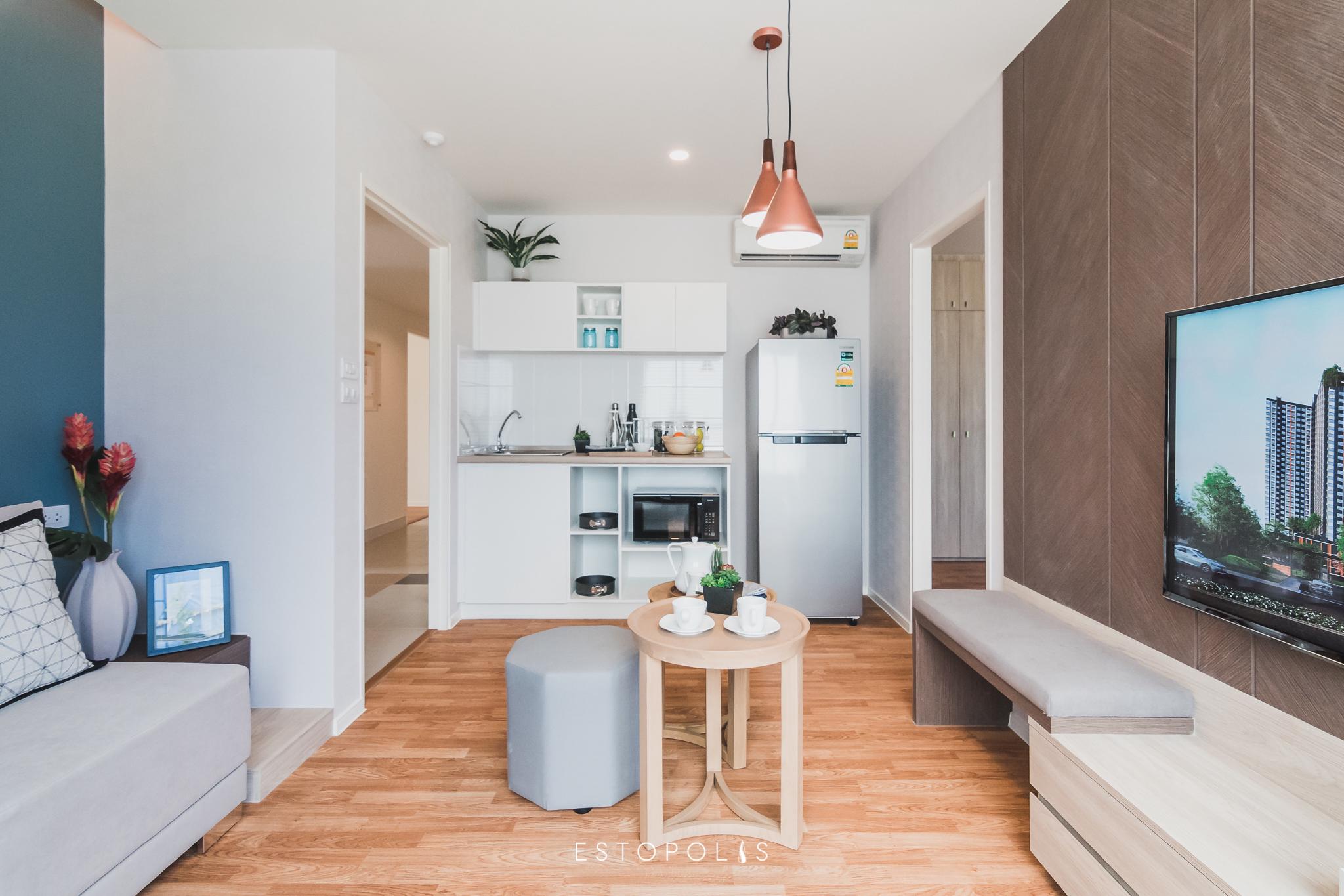 ภายในห้องจริง…ถัดออกมาจากโซนห้องครัวจะเป็นพื้นที่อเนกประสงค์ ให้เราปรับเปลี่ยนการใช้งานเองได้ตามใจ ซึ่งทางโครงการ Lumpini Ville Phattanakan - Srinakarin (ลุมพินี วิลล์ พัฒนาการ - ศรีนครินทร์) ก็ได้นำเสนอออกมาเป็น 'ห้องนั่งเล่น'