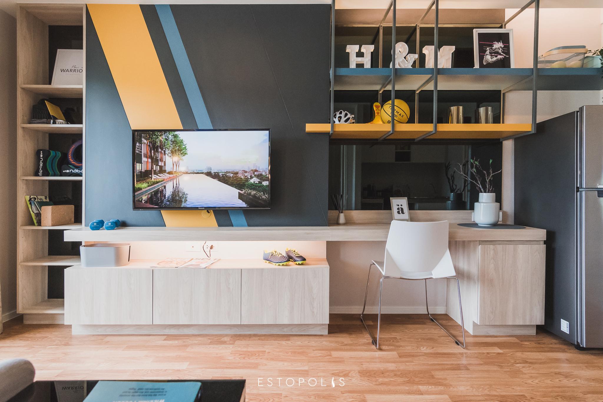 ตรงข้ามกับเตียงนอนถูกเปลี่ยนให้เป็นโต๊ะทำงานคู่กับชั้นวางทีวีได้อย่างลงตัว โดยฝั่งที่เป็นโต๊ะทำงานก็มีชั้นวางของตกแต่งให้เราได้วางของตกแต่งเพิ่มบรรยากาศดีๆ ภายในห้อง ส่วนฝั่งที่เป็นชั้นวางทีวี ทางโครงการได้จัดเตรียมปลั๊กไฟและช่องเสียบสายเคเบิลไว้แล้ว พร้อมมีการบิลต์อิน (Built-in) ตู้ใส่เพื่อความสวยงามและเพิ่มความเป็นระเบียบไปในตัว