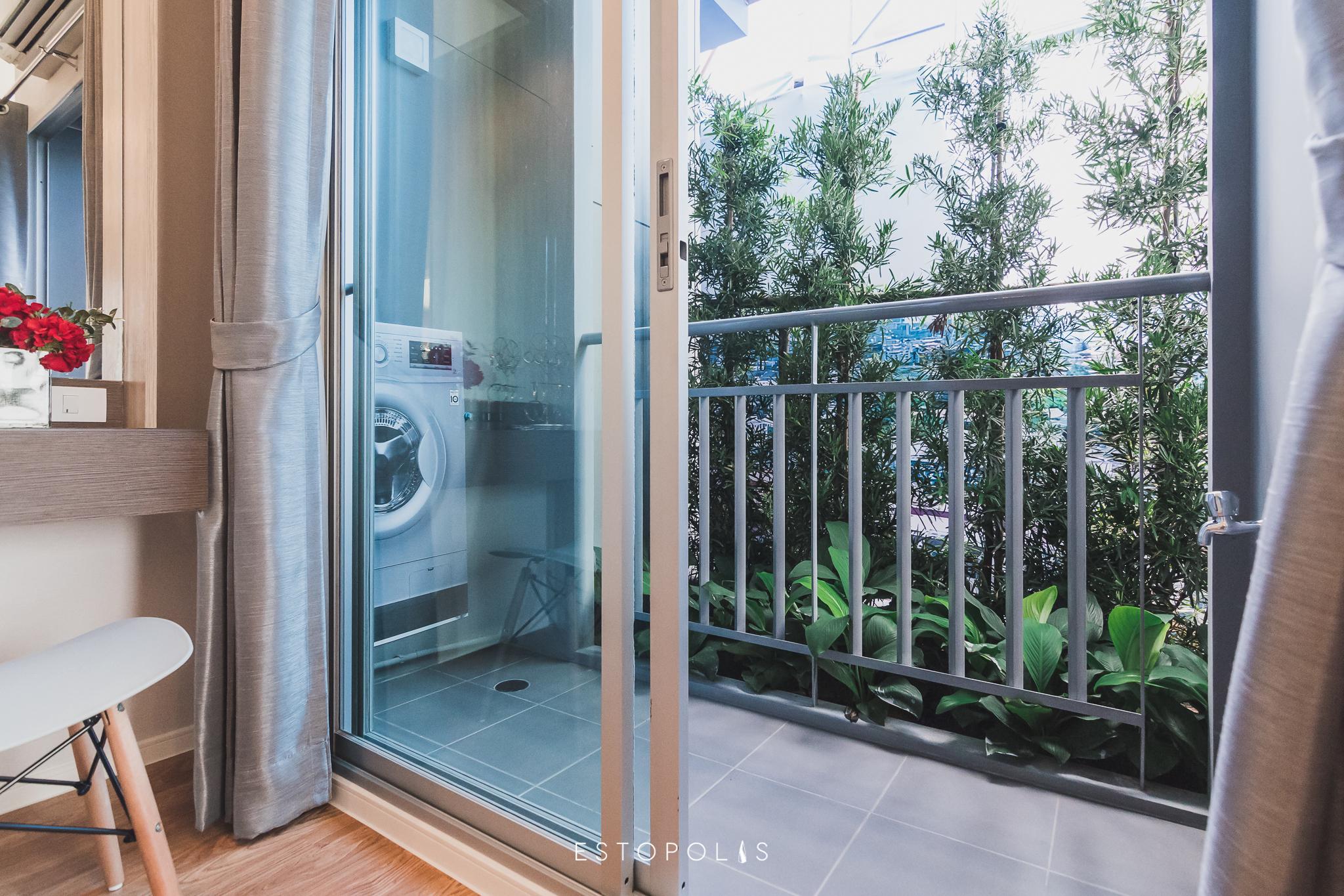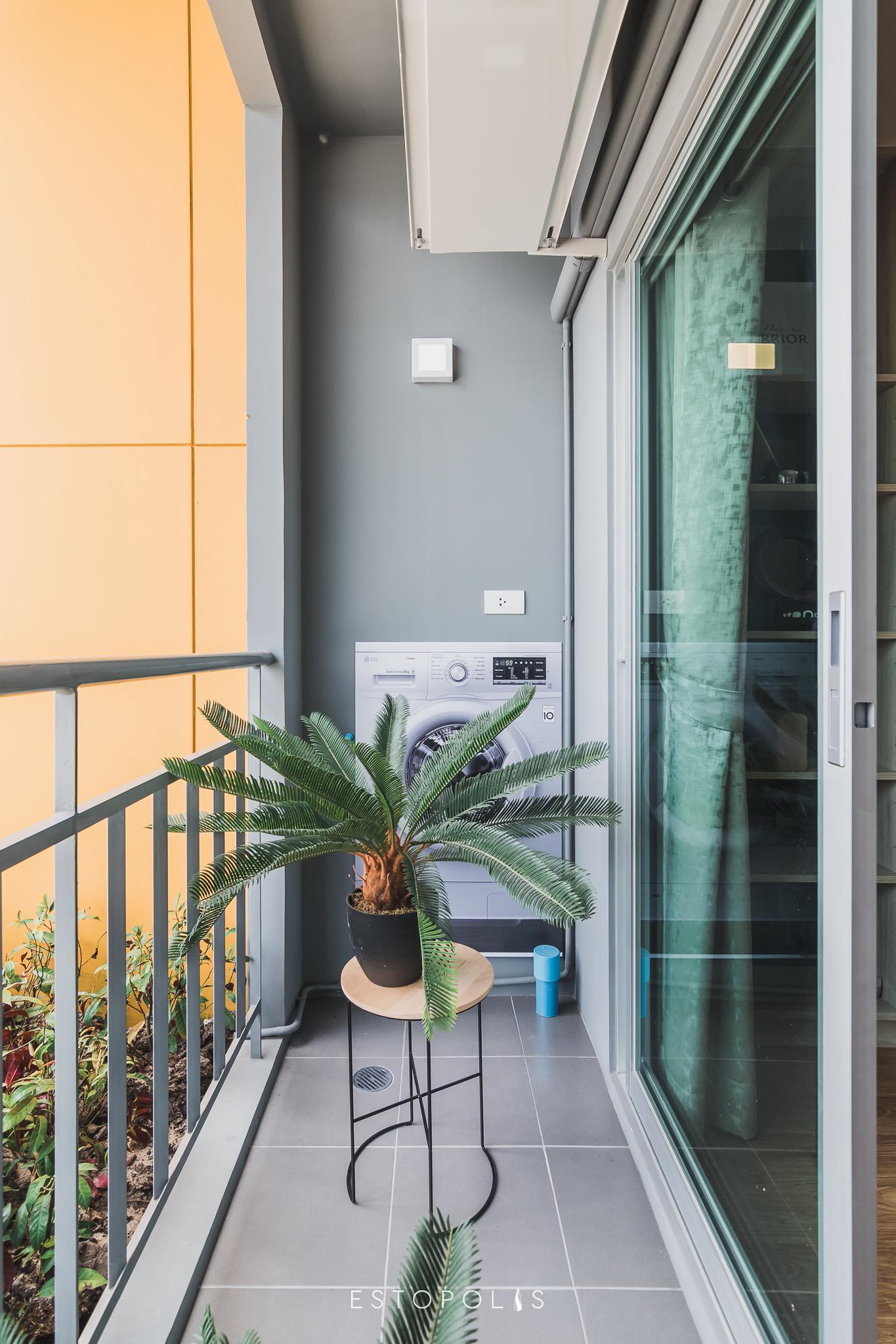 ส่วน 'ระเบียง' ของห้องนี้จะเปิดออกจากทางห้องนั่งเล่น ทางโครงการได้แขวนคอมเพรสเซอร์แอร์ 2 ตัวเอาไว้เหนือระเบียง ทำให้เรามีพื้นที่ใช้จัดสวนหรือตั้งโต๊ะกาแฟเล็กๆ ไว้บริเวณนี้ได้