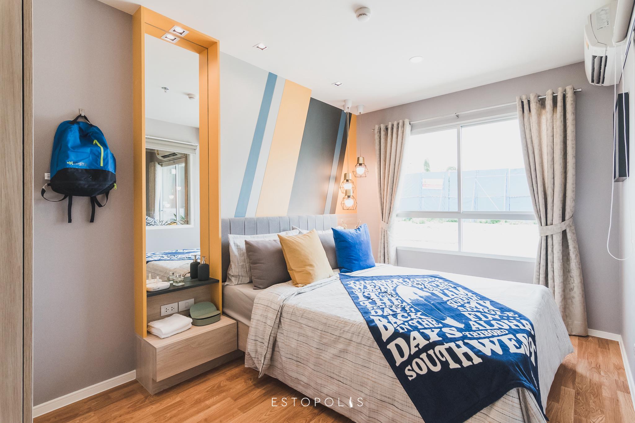 ขนาดเตียงที่ทาง Lumpini Ville Phattanakan - Srinakarin (ลุมพินี วิลล์ พัฒนาการ - ศรีนครินทร์) เลือกนำมาวางในห้องนี้จะเป็นเตียงขนาดควีนไซส์ 5 ฟุต ทำให้มีพื้นที่เหลือให้เดินสะดวกและยังสามารถตกแต่งเพิ่มเติมได้อีกเยอะ ข้างเตียงมีหน้าต่างบานใหญ่คอยเปิดรับแสงและลมจากธรรมชาติให้ผ่านเข้ามาในห้องได้อย่างเต็มที่