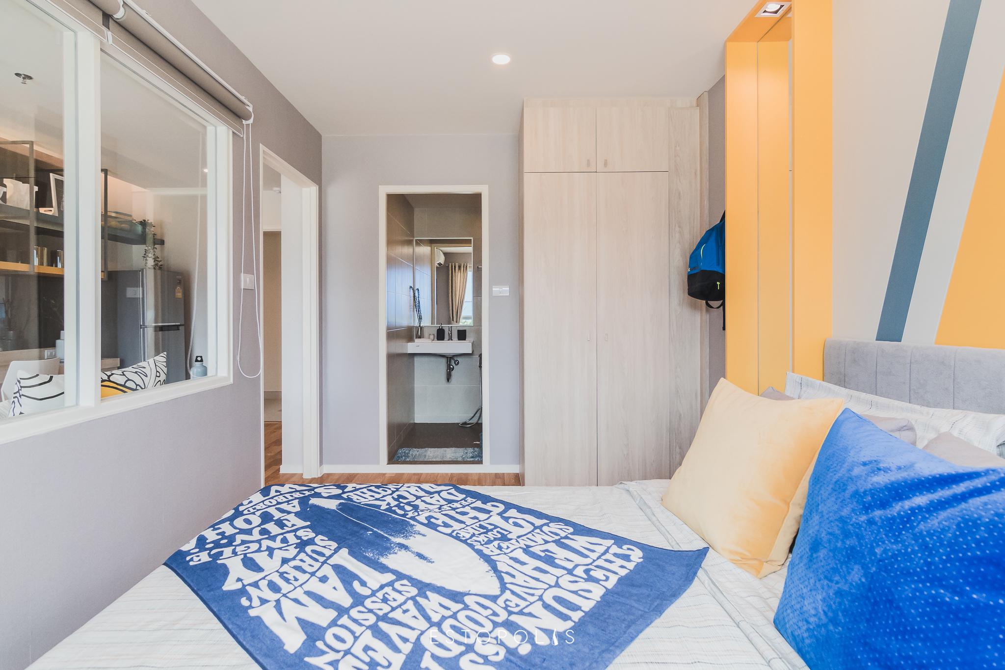 เข้าสู่พื้นที่ส่วนตัวของ 'ห้องนอน' มีการกั้นสัดส่วนแยกออกจากห้องครัวและห้องน้ำชัดเจนด้วยพาร์ติชั่นบานกระจกใสบานเลื่อน ช่วยแบ่งพื้นที่ให้ดูเป็นสัดส่วน ขณะเดียวกันก็ไม่ทำให้ห้องดูอึดอัดแม้จะเลื่อนปิดแล้วก็ตาม