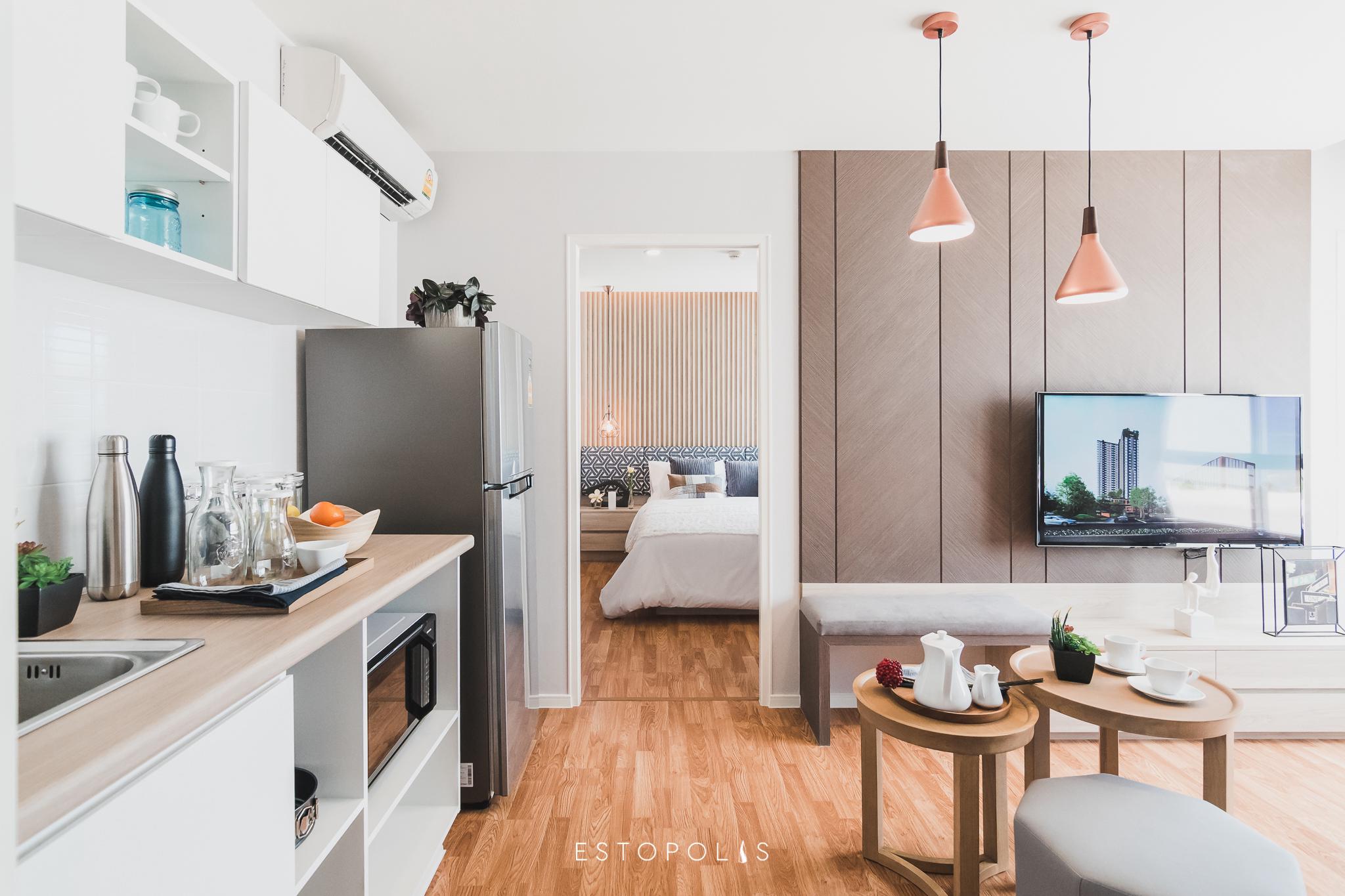 เมื่อเปิดประตูห้องมาจะเป็นพื้นที่ของห้องครัวแบบเปิดเชื่อมกับห้องนั่งเล่น เราจึงสามารถใช้พื้นที่ห้องได้อย่างเต็มที่ สำหรับใครที่อยากได้ห้องที่ดูกว้างและประหยัดพื้นที่ แนะนำให้แต่งห้องด้วยเฟอร์นิเจอร์บิลต์อิน (Built-in) ที่มีฟังก์ชันการใช้งานหลากหลาย พร้อมทั้งเลือกโทนสีสว่างมาแต่งเพื่อให้เข้ากับพื้นลามิเนตที่ทางโครงการจัดเตรียมให้