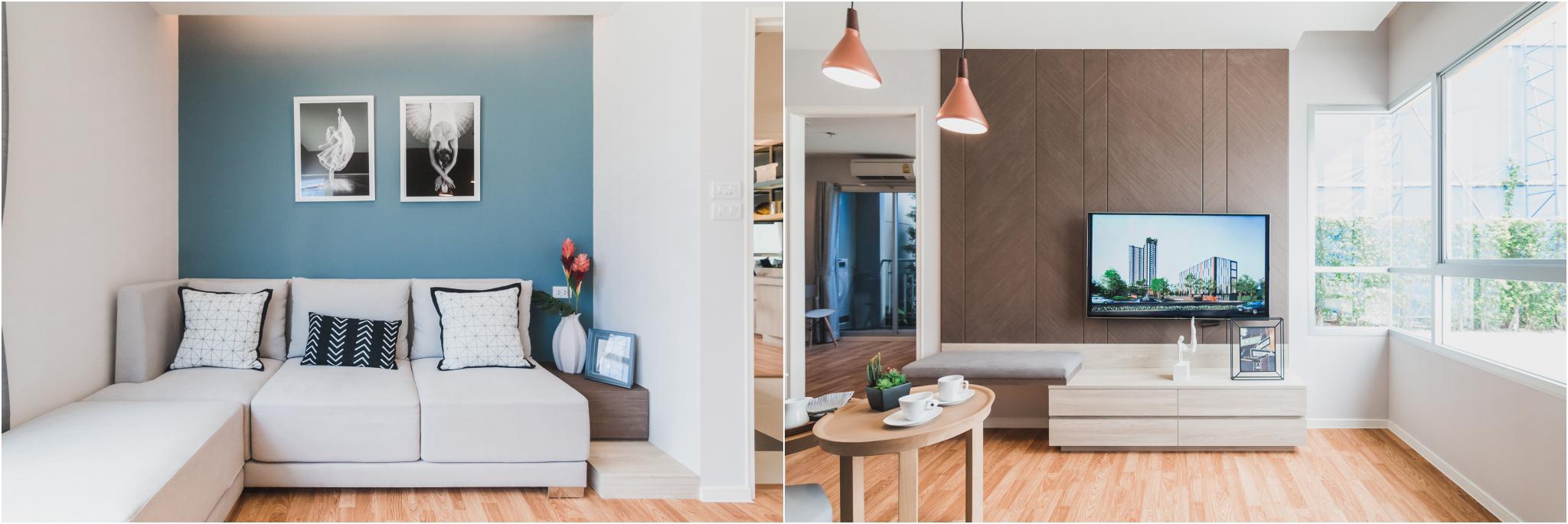ตกแต่งห้องนั่งเล่นด้วยชุดโซฟาแบบเข้ามุมนั่งได้ 2-3 คน ตรงข้ามกันติดตั้งทีวีขนาดใหญ่ได้ และเนื่องจากมีพื้นที่จากหน้าทีวีไปจนถึงโซฟามากพอสมควร แนะนำให้วางโต๊ะกลางเล็กๆ เพิ่มไว้อีกตัวให้คุณวางของหรือพักผ่อนได้สะดวกมากขึ้น