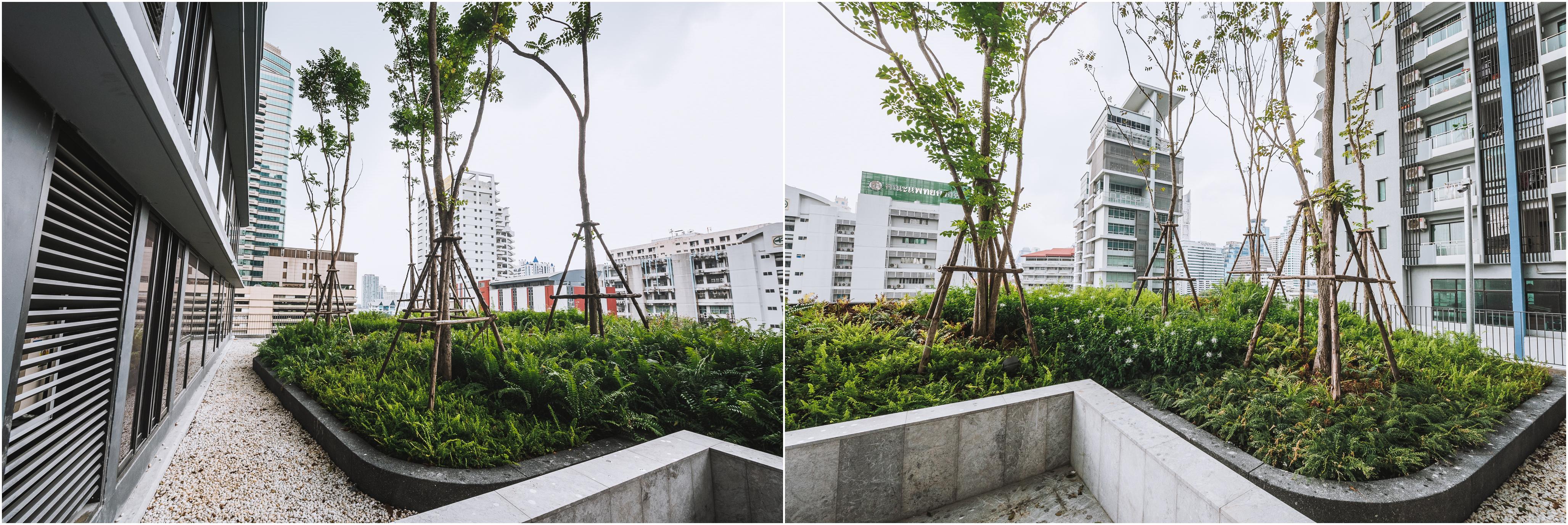 ส่วนด้านหลังอาคารจะเป็น Dynamic Garden พื้นที่สีเขียวสำหรับรองรับการพักผ่อน สามารถแวะมานั่งพักเหนื่อยหรือผ่อนคลายชิลล์ๆ พบปะผู้คนในช่วงเย็นได้อย่างสบายใจ