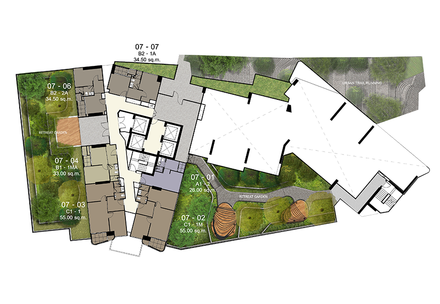 ขยับขึ้นมาบนส่วนกลางชั้น 7 โดยชั้นนี้จะตกแต่งเป็นสวนหย่อมสำหรับนั่งพักผ่อนชิลล์ๆ เชื่อมกับ Urban Trail Running และมีมุมให้นั่งเล่นสูดอากาศสบายๆ พร้อมวิวสวนสีเขียวบริเวณด้านหลังอาคาร
