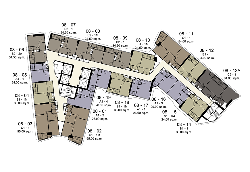 ขึ้นมาที่แปลนอาคารชั้น 8-15 จะเป็นชั้นของห้องพักอาศัยทั้งชั้น รวม 19 ยูนิต ประกอบด้วย