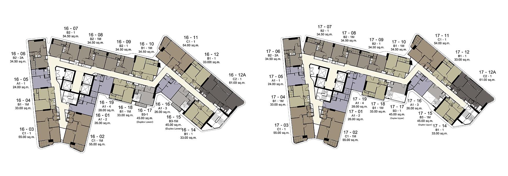 สำหรับชั้น 16-31 จะมีจำนวนห้องพักอาศัยรวม 19 ยูนิต และมีแปลนอาคารคล้ายๆ กับชั้นล่าง แต่จะมีห้องแบบ Duplex เพิ่มเข้า 2 ห้องแทนที่ห้อง Studio ฝั่งขวามือ ซึ่งชั้นเลขคี่จะมีการปรับผังห้องเล็กน้อย เพื่อให้เป็นพื้นที่ชั้น 2 ของห้อง Duplex นั่นเอง แบ่งเป็น