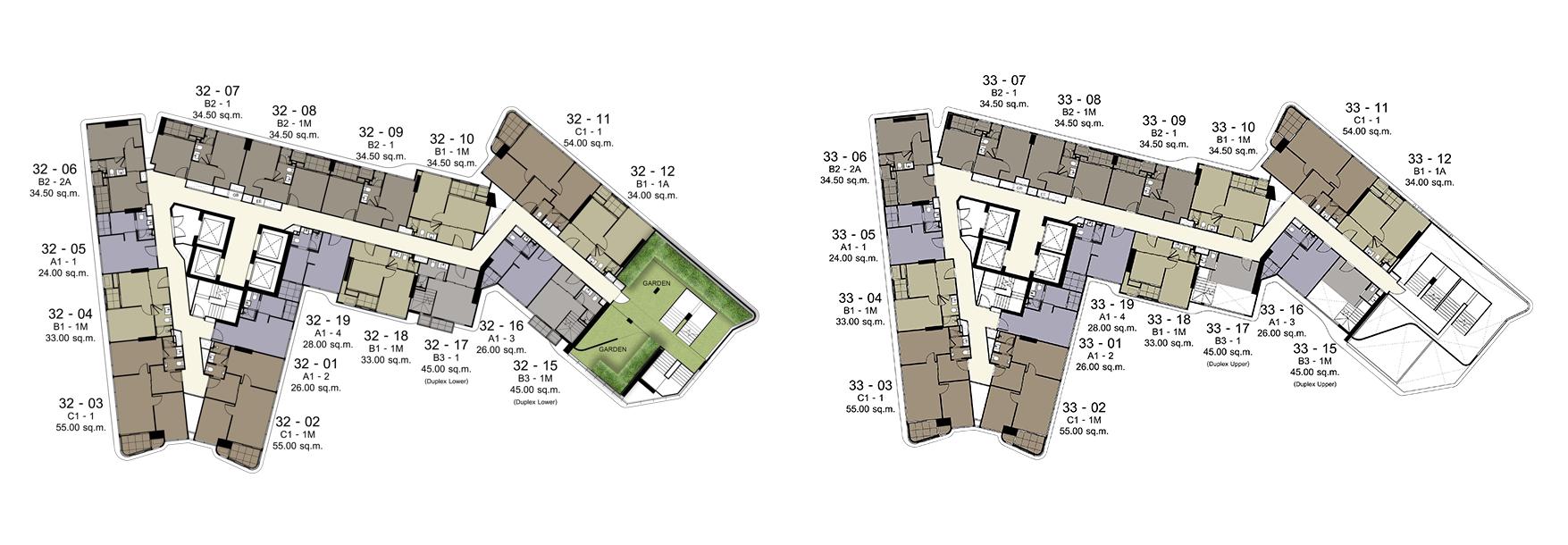 พอขึ้นมาชั้น 32-33 ก็จะมีห้องพักอาศัยลดเหลือ 17 ยูนิต เนื่องจากฝั่งขวามือติดถนนเพชรบุรีจะถูกออกแบบให้สวนลอยฟ้าและพื้นที่ว่าง ประกอบด้วย