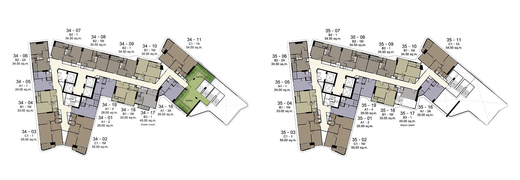- แบบห้อง 1 ห้องนอน ขนาด 33.00 - 34.50 ตารางเมตร