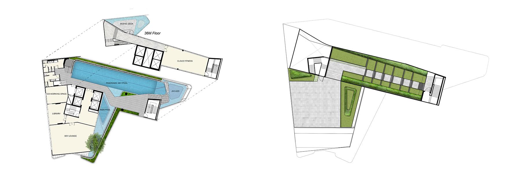 สำหรับบริเวณชั้น 36 และ Rooftop จะเป็นชั้นของพื้นที่ส่วนกลางหลัก ประกอบไปด้วย Sky Lounge, Panoramic Skypool และ Jacuzzi ที่สามารถมองเห็นวิวฝั่งพระราม 9 ได้ ใกล้กันเป็น Library & Co-Working space, Cloud Fitness, Changing Rooms, Steam room and SaunaSky Lounge, Panoramic Skypool, Jacuzzi , Library & Co-Working space และมีโซน Cloud Fitness แยกออกมาตรงชั้น Mezzanine สามารถมองเห็นวิวสระว่ายน้ำด้านล่างได้ ส่วนชั้นดาดฟ้าจะเป็นสวนสีเขียวแบบขั้นบันไดให้เราใช้พักผ่อนหย่อนใจ