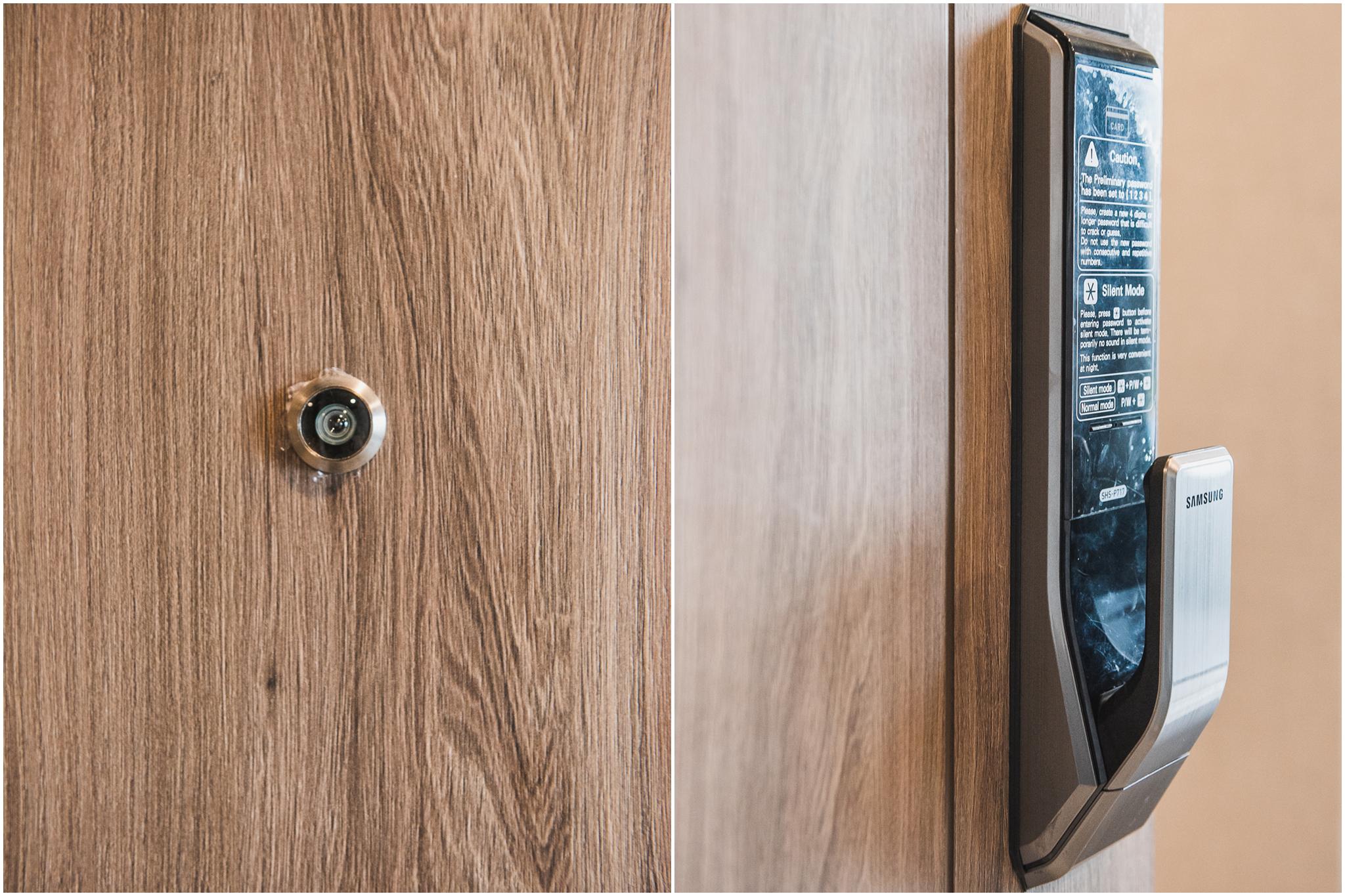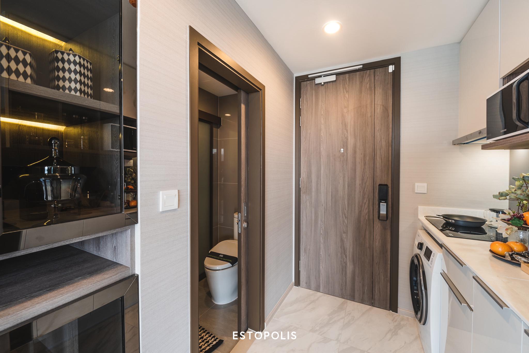 เริ่มสำรวจพื้นที่ด้วยการปลดล็อกบานประตูดิจิทัล เข้าไปพบกับห้องครัวแบบปิด กั้นด้วยพาร์ติชั่นกระจกใสช่วยป้องกันกลิ่นและควันรบกวน ซึ่งเราสามารถมองทะลุออกไปเห็นพื้นที่ของห้องนั่งเล่นได้ ทำให้ห้องดูไม่อึดอัดและคับแคบ