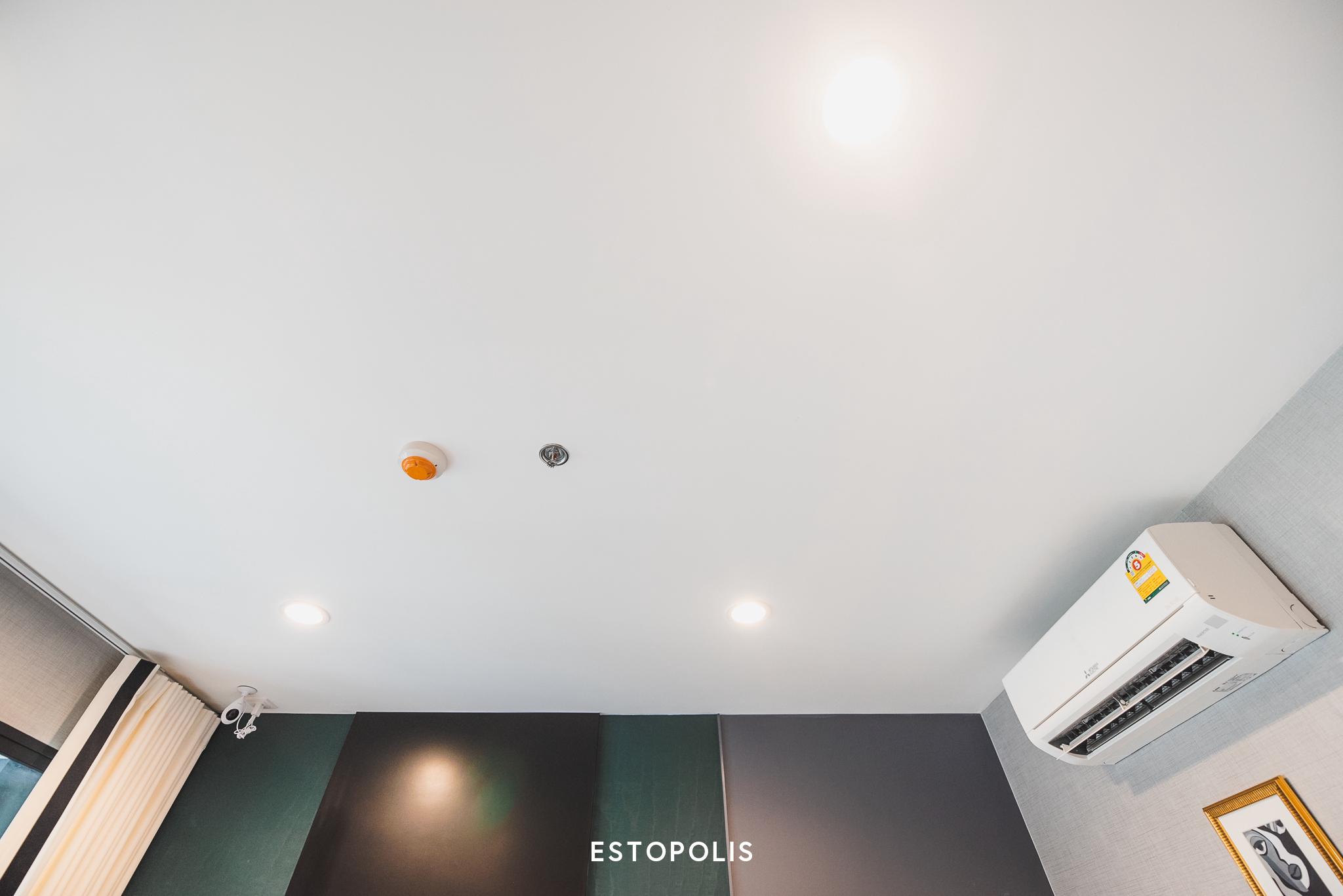 เพดานห้องทุกส่วนจะติดตั้งไฟ Downlight รวมถึงอุปกรณ์ตรวจจับความร้อน และหัวกระจายน้ำดับเพลิงเอาไว้ให้เรียบร้อย เพื่อความมั่นใจและอุ่นใจเสมอแม้เราจะไม่ได้อยู่ที่ห้อง ส่วนแอร์ที่ทาง IDEO Mobi Asoke - (ไอดีโอ โมบิ อโศก) ติดตั้งมาให้นั้น เป็นของ Mitsubishi Electric Mr.Slim INVERTER ที่เน้นเรื่องการประหยัดไฟฟ้าเป็นพิเศษ