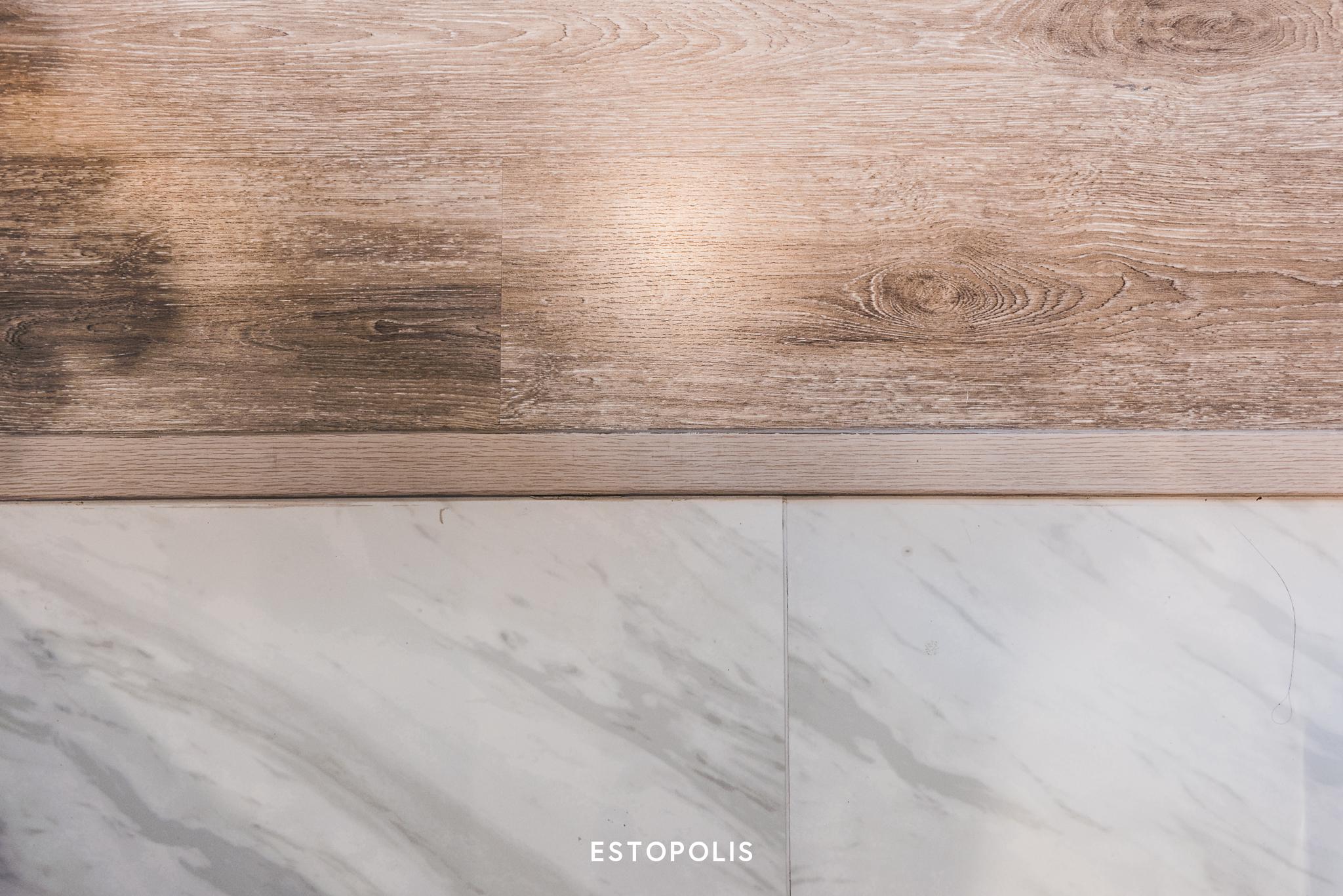 และหากสังเกตที่พื้นห้องจะรู้ว่า...พื้นที่ของส่วนอยู่อาศัยกับส่วนครัวจะแตกต่างกัน โดยพื้นของห้องนั่งเล่นและห้องนอนจะเป็นลามิเนตสำเร็จรูปหนา 12 มม. เดินสบายเท้า ส่วนพื้นครัวจะเป็นกระเบื้องเซรามิคขนาด 60*60 ซม. แทน เพื่อความสวยงามและง่ายต่อการดูแลทำความสะอาด