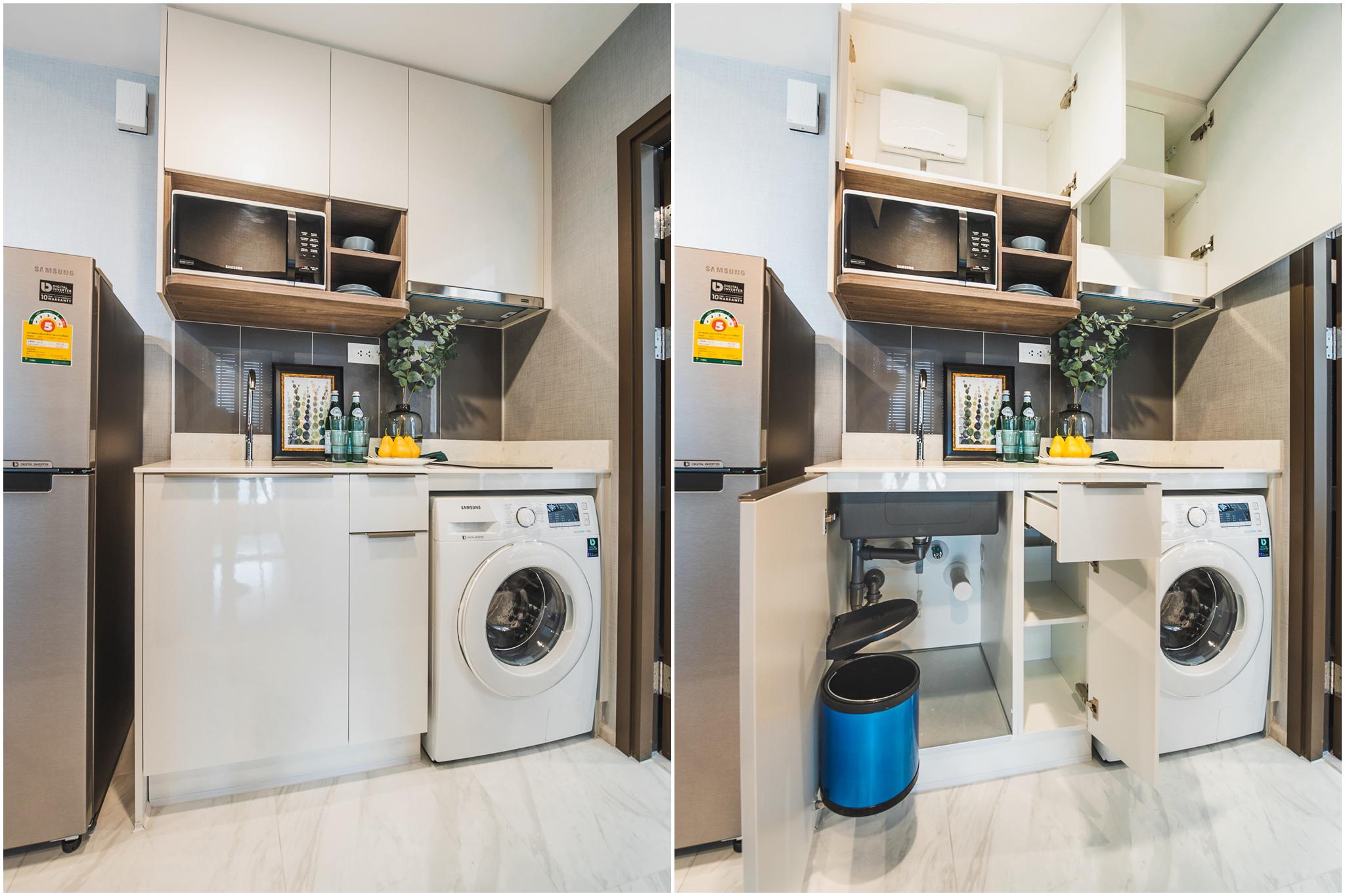 โดยชุดครัวทางโครงการ IDEO Mobi Asoke - (ไอดีโอ โมบิ อโศก) บิลต์อินมาให้นั้น จะรองรับการอยู่อาศัยที่ครบครัน บริเวณเคาน์เตอร์ครัวมีลิ้นชักและตู้เก็บของบาน Soft Close ให้ พร้อมช่องใส่เครื่องซักผ้าฝาหน้า ส่วนชั้นบิลต์อินด้านบนก็ทำจากวัสดุลามิเนตผิวเคลือบเงาสีขาวสะอาดตาเช่นกัน มีช่องให้เก็บของได้หลากหลายฟังก์ชัน