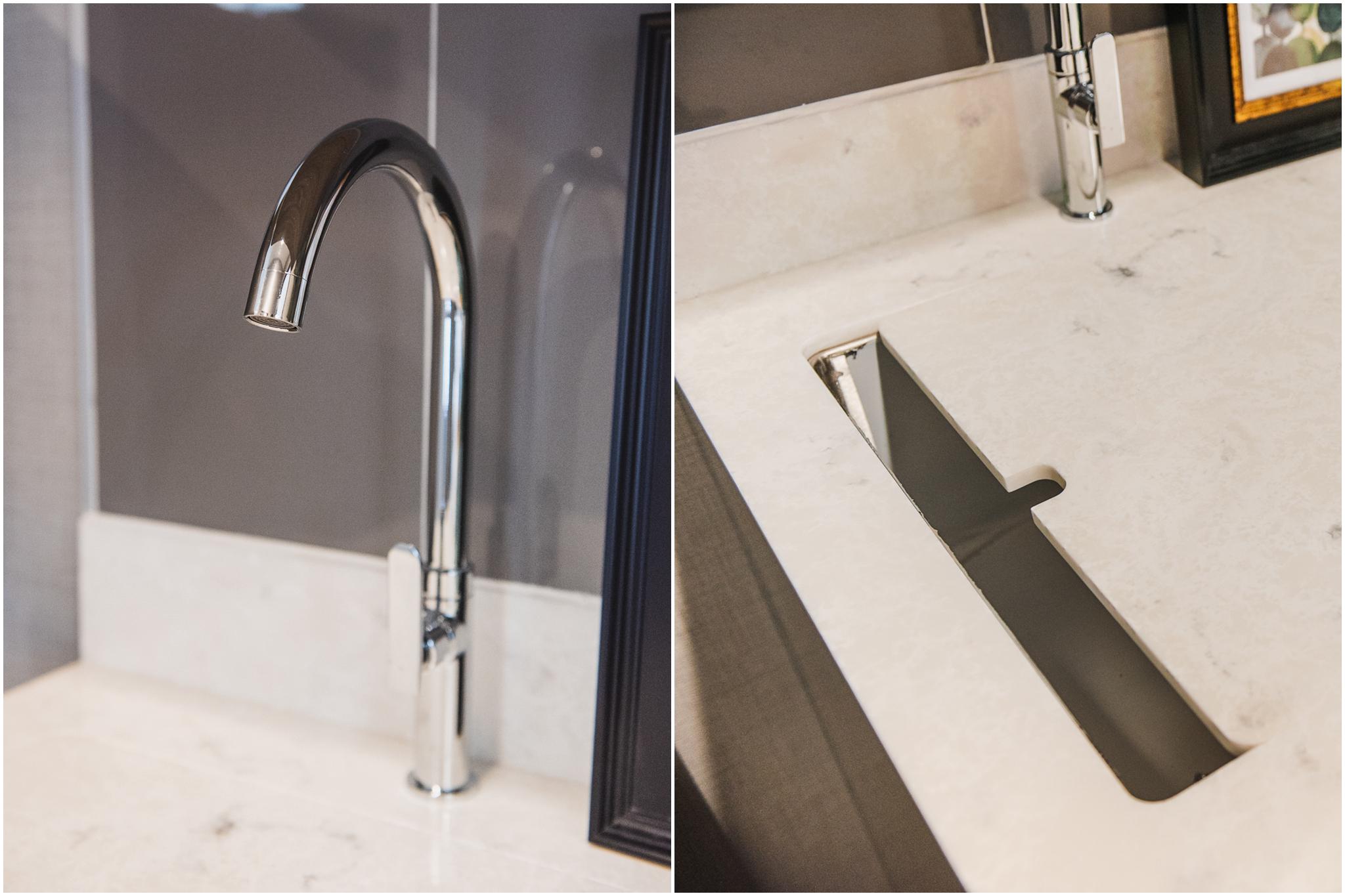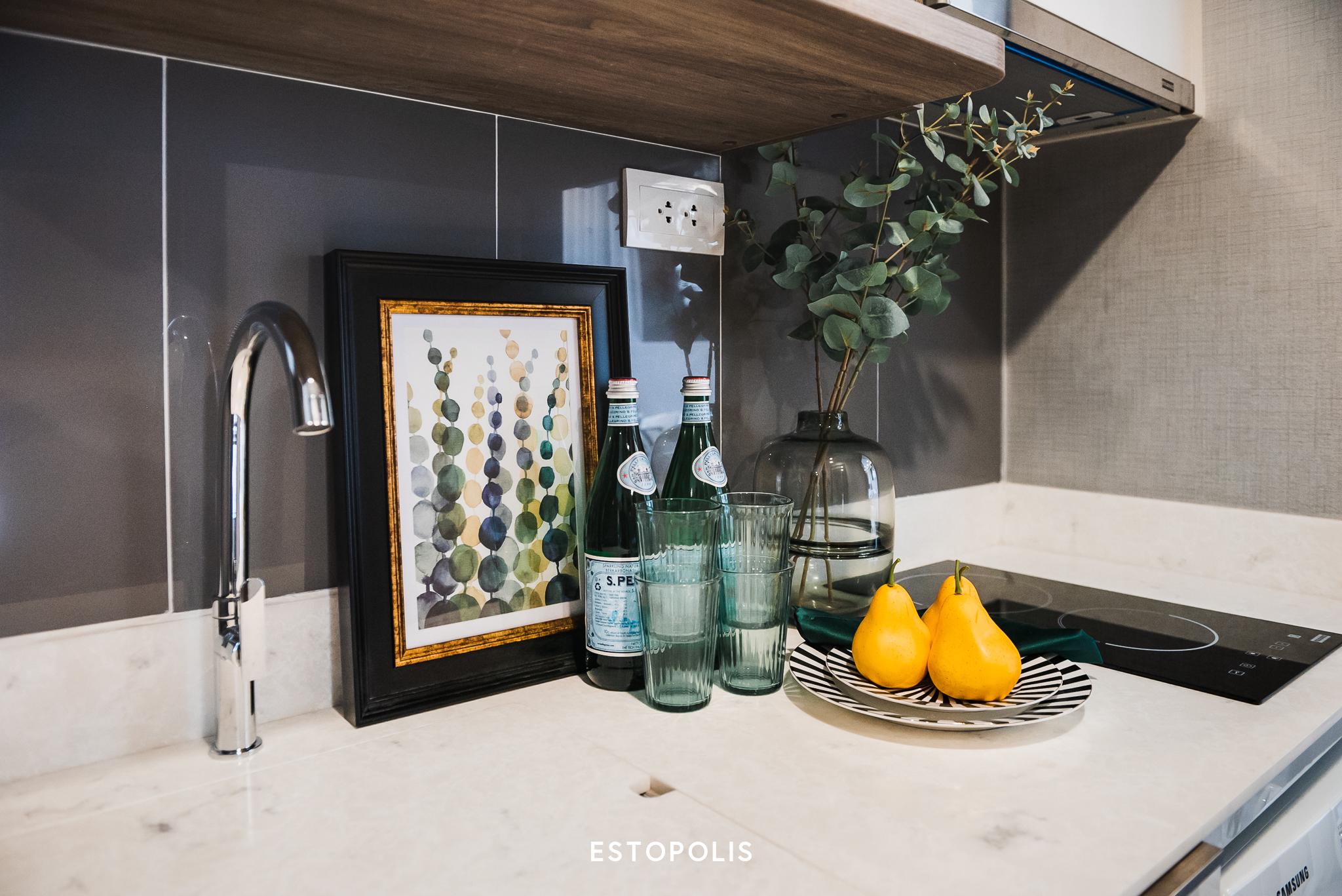 ขยับไปบริเวณซิงค์ล้างจาน ก็จะมีแผ่นปิดหินสังเคราะห์สำหรับใช้ปิดหน้าอ่างมาให้เช่นเดียวกับห้องแรก ช่วยเพิ่มพื้นที่การใช้สอย เราจึงทำครัวได้สะดวกขึ้น นอกจากนี้ยังวางระบบแจ้งเตือน Water leakage sensor ไว้ให้เป็นมาตรฐานเดียวกันทั้งโครงการ