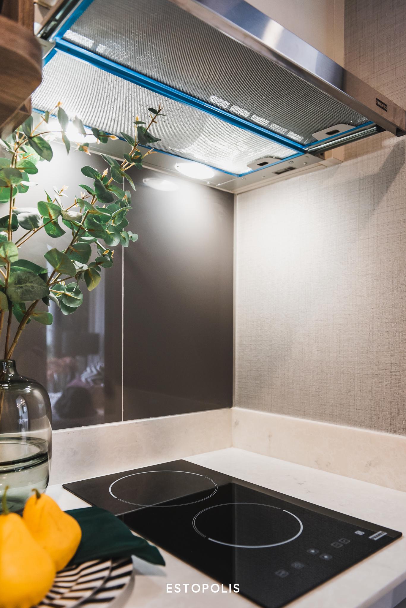 สำหรับอุปกรณ์ครัวที่ทางโครงการมอบให้นั้น จะมีเตาไฟฟ้าขนาด 2 หัวพร้อมเครื่องดูดควันระบบปล่อยนอกอาคารจากแบรนด์ Franke เราจึงหมดกังวลเรื่องกลิ่นควันรบกวน