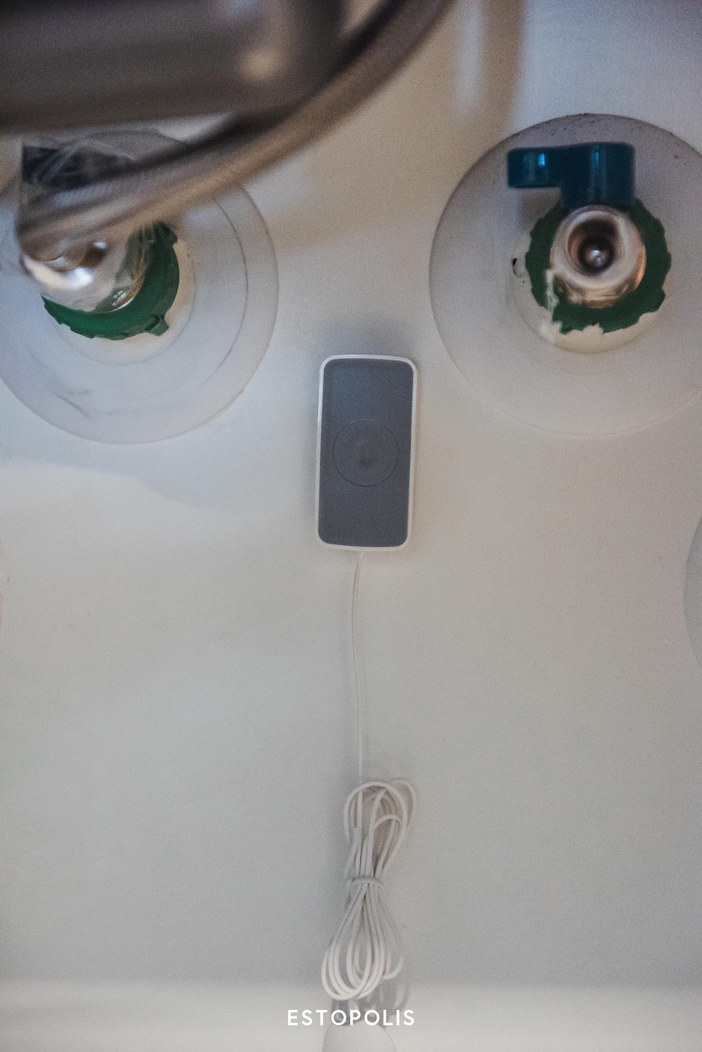 และหากก้มลงไปด้านใต้เคาน์เตอร์ซิงก์ล้างจาน เราก็จะเจอกับ Water leakage sensor อุปกรณ์ตรวจจับการรั่วซึ่มของน้ำที่ทาง IDEO Mobi Asoke - (ไอดีโอ โมบิ อโศก) ติดตั้งมาให้ ไว้แจ้งเตือนความผิดปกติของระบบน้ำยามมีปัญหาน้ำรั่วหรือน้ำล้น เราจึงสามารถจัดการได้อย่างทันท่วงที