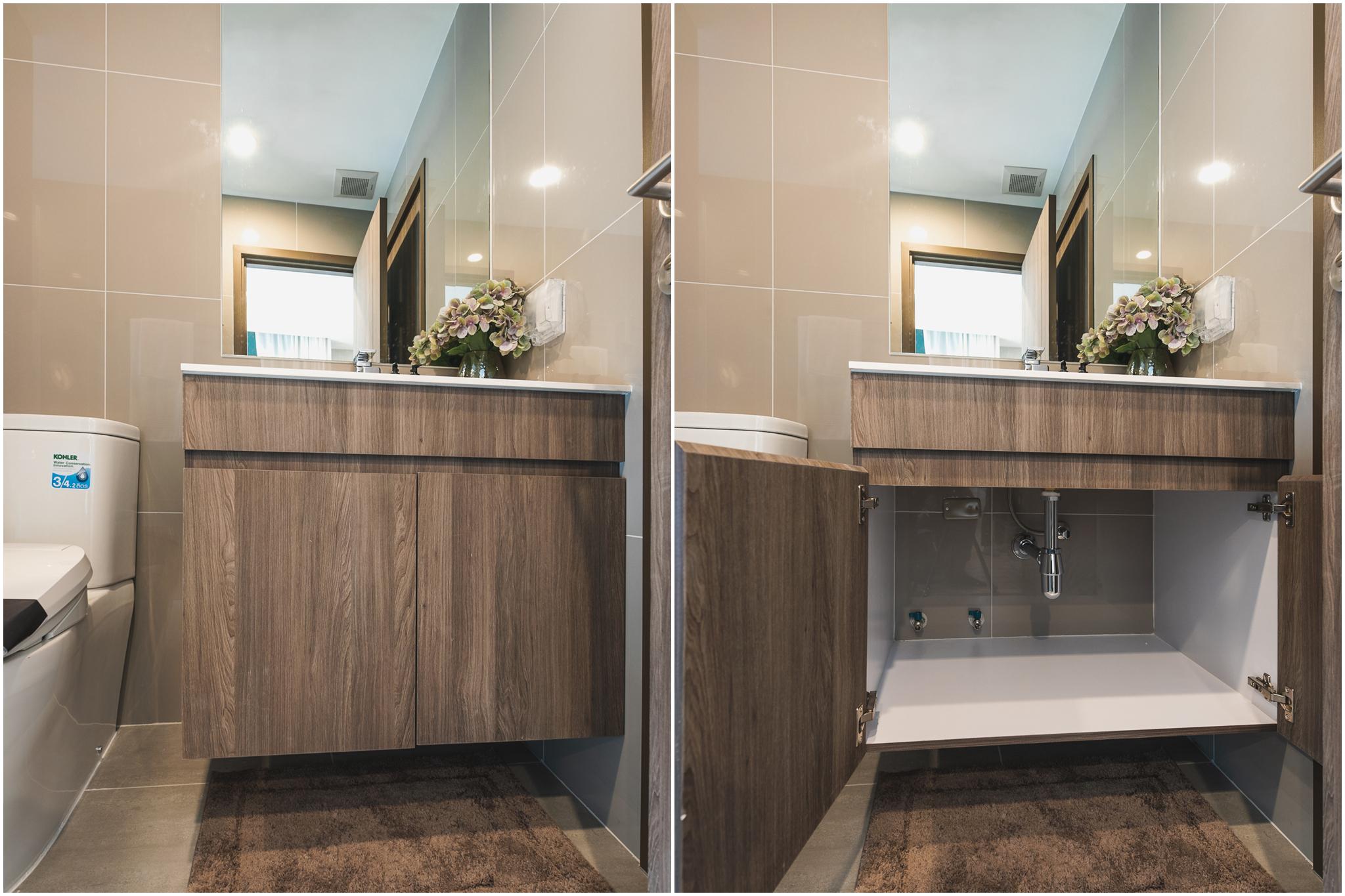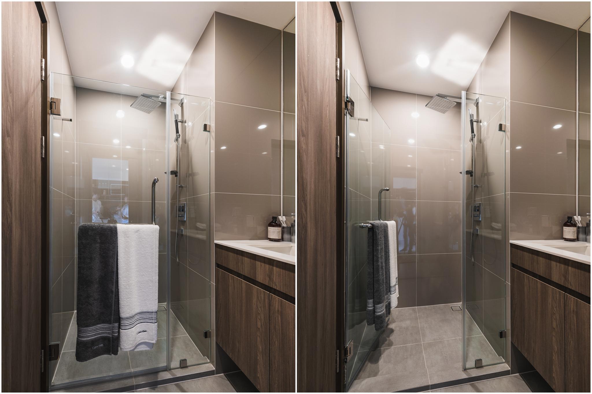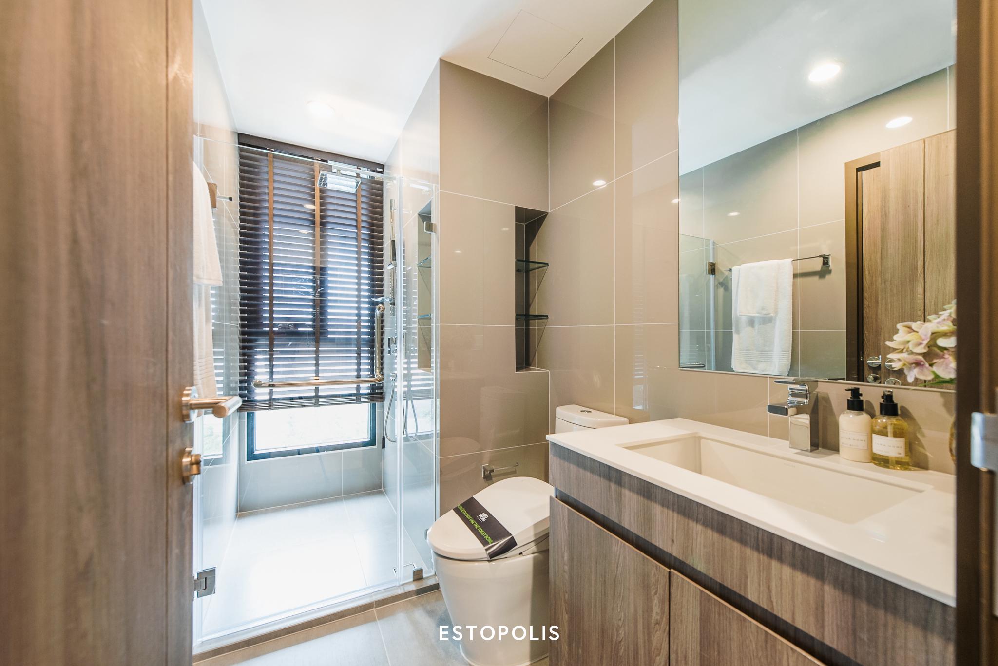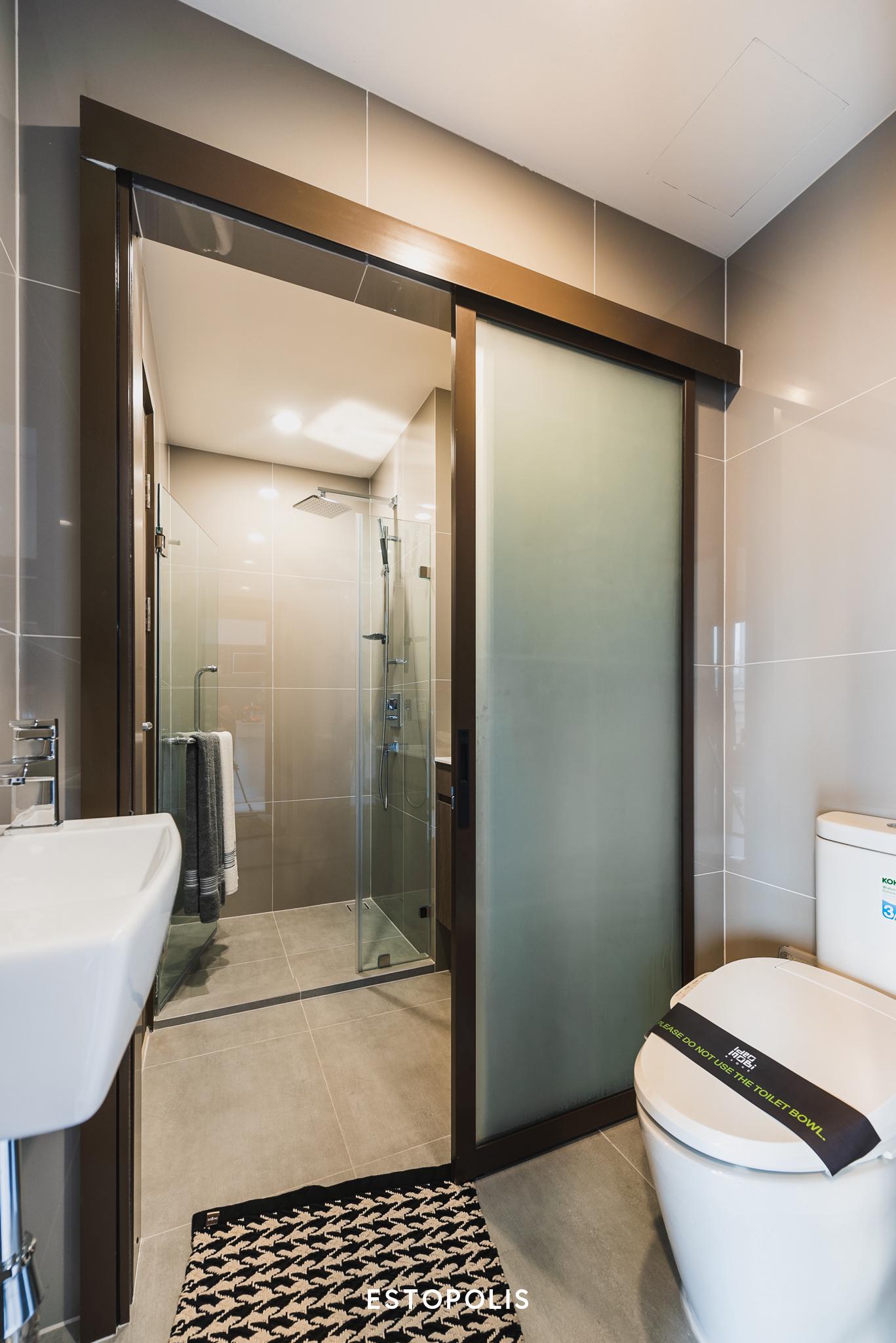 บริเวณหน้าห้องน้ำจะวางโถสุขภัณฑ์กับอ่างล้างมือไว้คู่กัน ถัดเข้าไปจึงเป็นโซนของอ่างล้างหน้าที่กั้นไว้ด้วยพาร์ติชั่นบานเลื่อน และจึงเป็นห้องอาบน้ำอยู่ด้านในสุด แยกสัดส่วนป้องกันน้ำกระเด็นได้อย่างมีประสิทธิภาพ ซึ่งเราสามารถเข้า-ออกห้องน้ำนี้ได้ 2 ทาง คือ จากห้องครัวและห้อง Master Bedroom จึงสะดวกสำหรับผู้อยู่อาศัยที่ต้องการความเป็นส่วนตัว และง่ายยามจะใช้งานตอนกลางคืน