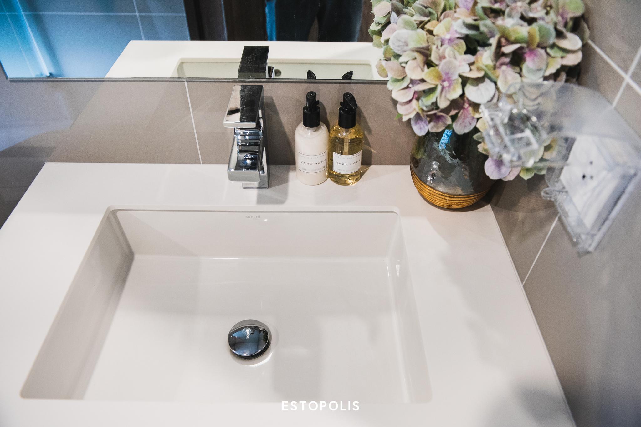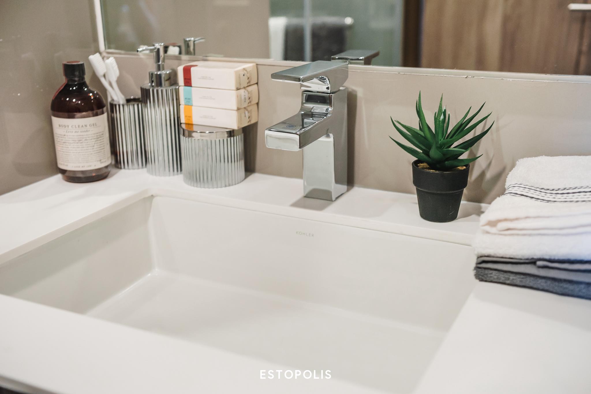 โครงการ IDEO Mobi Asoke - (ไอดีโอ โมบิ อโศก) ได้เลือกใช้อ่างล้างหน้าหินสังเคราะห์สีขาวผิวเรียบจากแบรนด์ Kohler ในการตกแต่งห้องน้ำ พร้อมมีพื้นที่รอบอ่างให้วางของใช้ เครื่องสำอางได้ค่อนข้างเยอะ ส่วนก๊อกน้ำก็รองรับระบบน้ำร้อนได้ด้วย