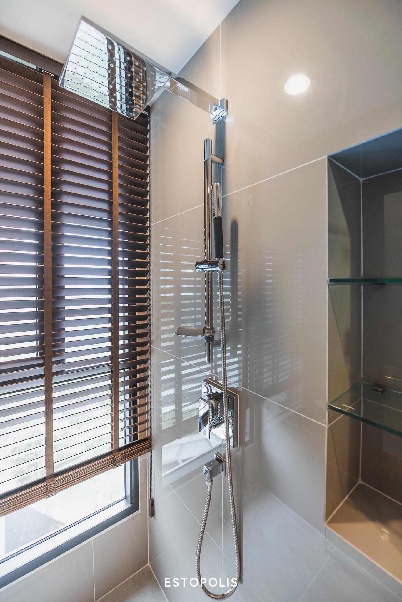 สำหรับใครที่ต้องการผ่อนคลายความเหนื่อยล้าที่สะสมมาทั้งวันแล้ว ในห้องอาบน้ำก็มีระบบ Rain Shower และ Hand Shower ให้เลือกใช้ตามความต้องการ แล้วเอาใจคนรักการอาบน้ำด้วยช่องวางของแบบ Drop Wall แบ่งชั้นด้วยแผ่นกระจกใส ทำให้เราวางขวดสบู่ แชมพูได้สะดวก อยู่ใกล้มือ เอื้อมหยิบก็ง่าย