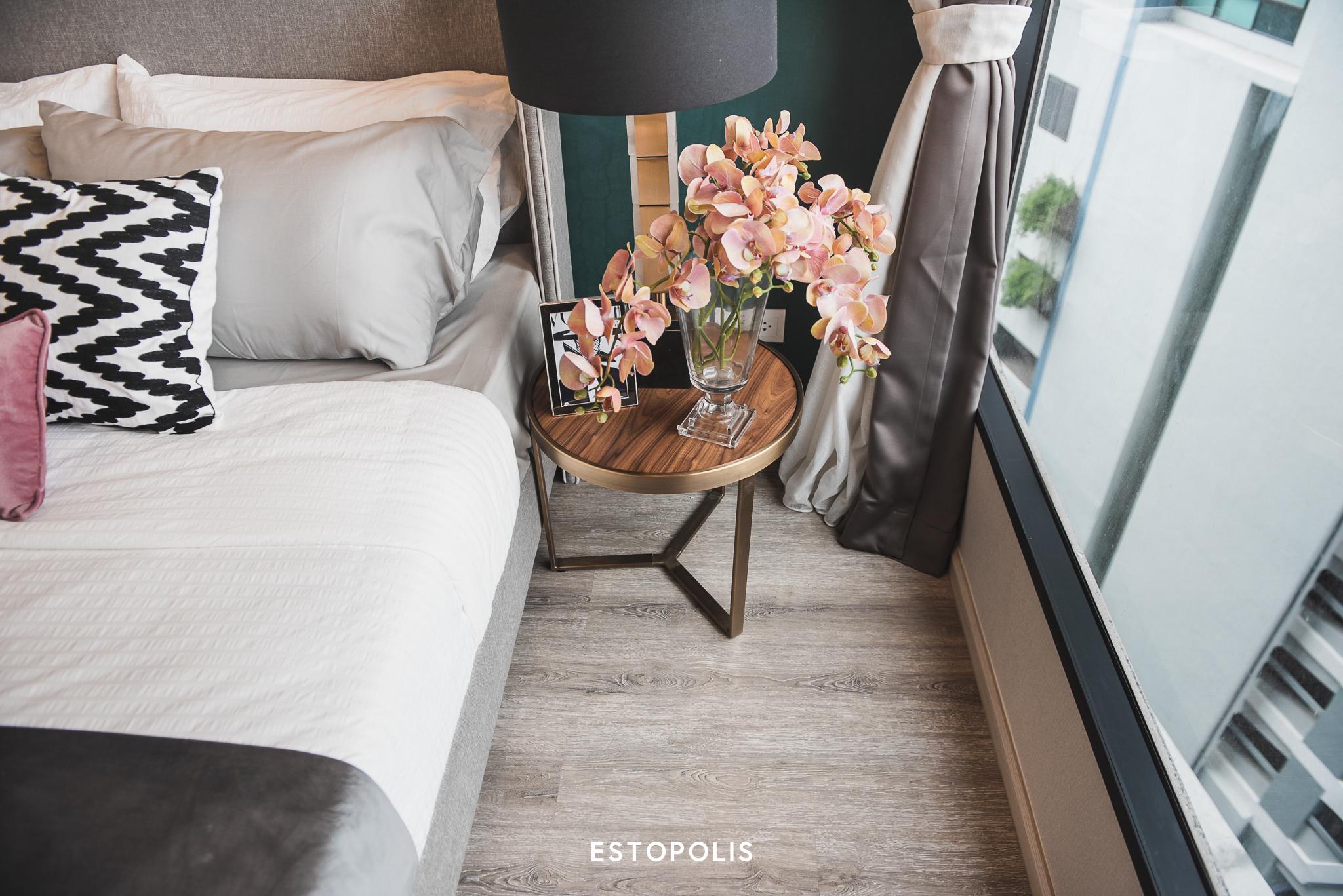 จุดเด่นของห้องพักอาศัยในโครงการ IDEO Mobi Asoke - (ไอดีโอ โมบิ อโศก) จะอยู่ที่กระจกบานใหญ่ ไม่ถูกบล็อกวิวมุมสูง ฉะนั้นหากเราลองวางโต๊ะเล็กๆ สักตัวไว้นั่งชมบรรยากาศ City view สวยๆ ขณะทำงานไปด้วยก็ดูจะเป็นความคิดที่ดีไม่น้อย เพราะบริเวณข้างเตียงฝั่งนี้ก็ยังมีพื้นที่เหลือค่อนข้างเยอะ หากขยับเตียงนิด ปรับมุมอีกหน่อย รับรองว่า...เราจะได้ห้องนอนที่ลงตัวน่าอยู่แน่นอน