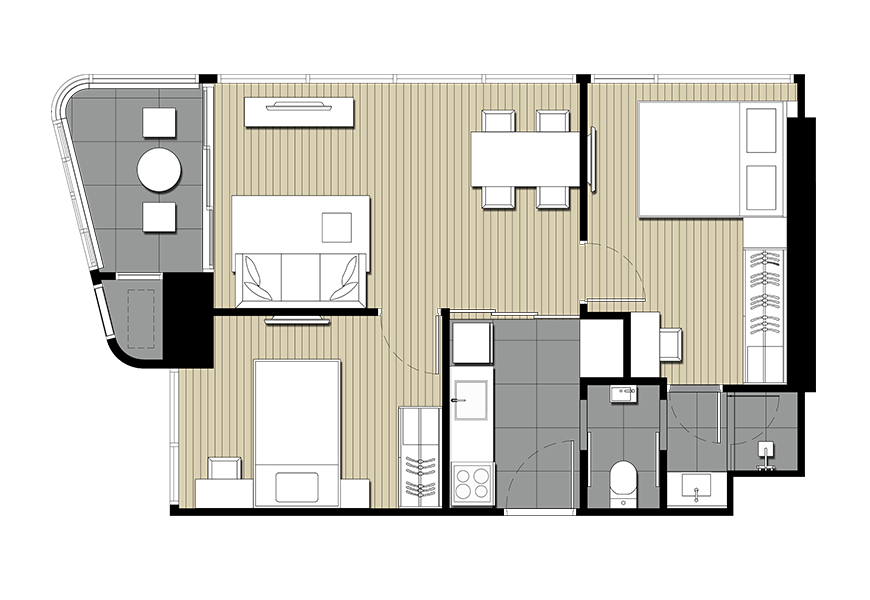 เมื่อก้าวเข้าห้องมา...เราจะเจอกับห้องครัวแบบปิดที่มีพาร์ติชั่นกั้นก่อนเป็นอันดับแรก ขยับตรงไปเป็นพื้นที่โล่งที่สามารถออกแบบให้เป็นห้องนั่งเล่นและมุมทานอาหารได้สบายๆ เชื่อมกับระเบียงกระจกโค้ง ช่วยสร้างบรรยากาศในห้องให้ดูสดใสขึ้น ส่วนขวามือจะเป็นห้อง Master Bedroom ที่มีห้องน้ำในตัว และมีห้องนอนเล็กอยู่เชื่อมกับห้องนั่งเล่น